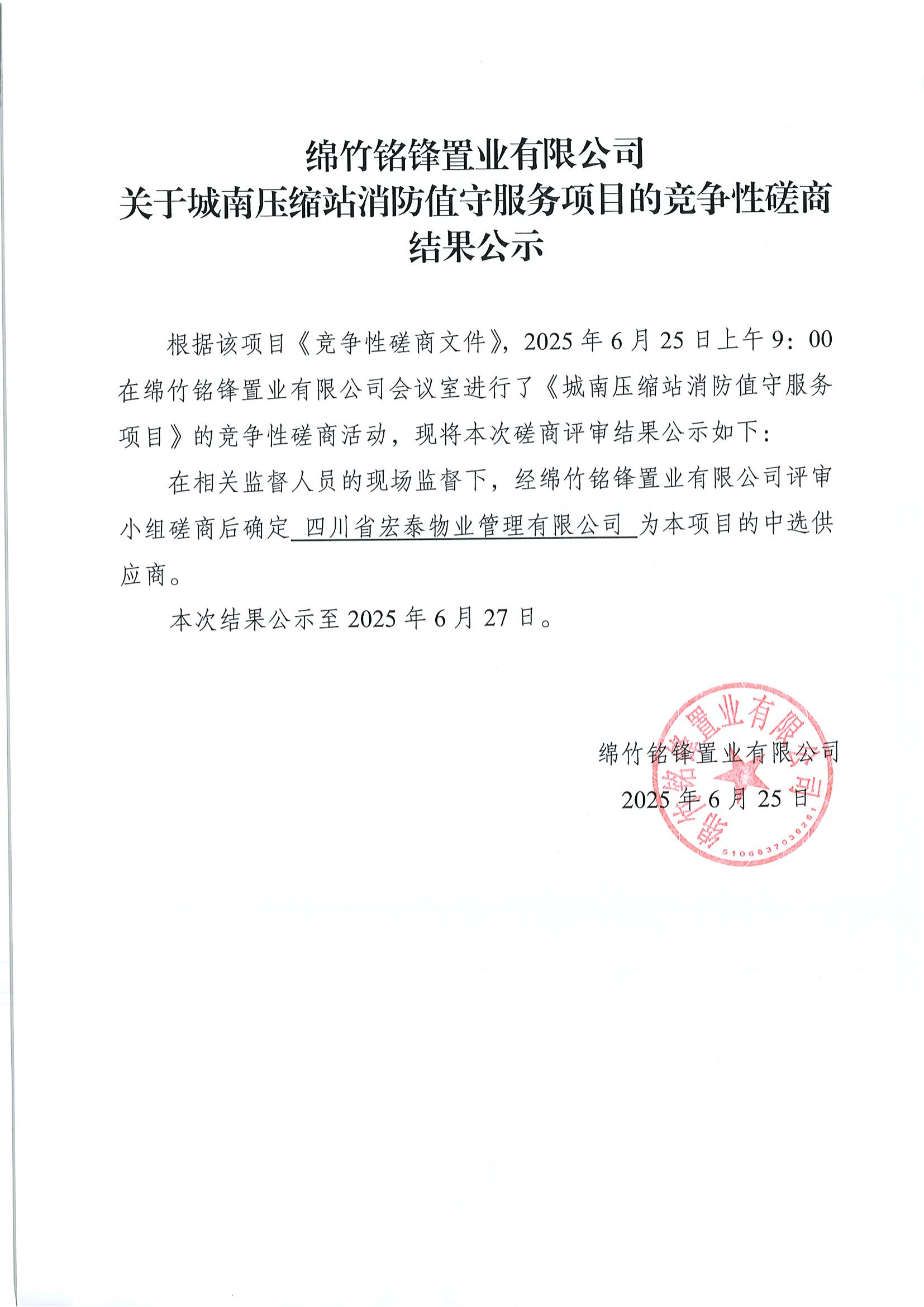 关于城南压缩站消防值守服务项目的竞争性磋商结果公示