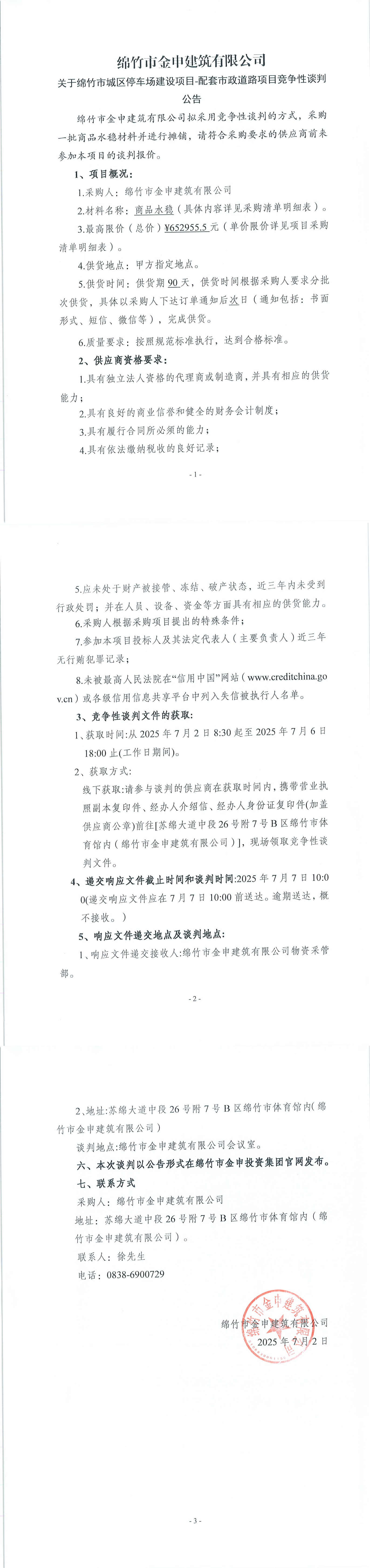 城区停车场建设项目(商品水稳)材料采购竞争性谈判公告