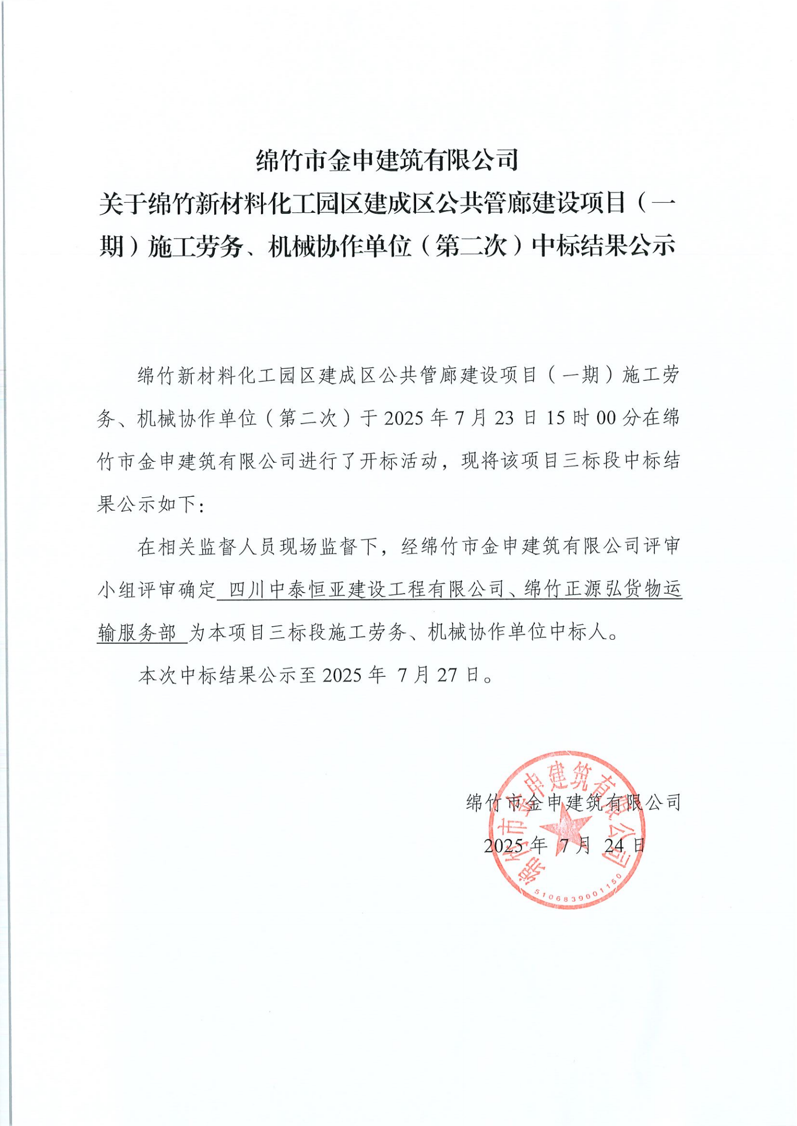 绵竹新材料化工园区管廊一期劳务、机械第二次中标公告