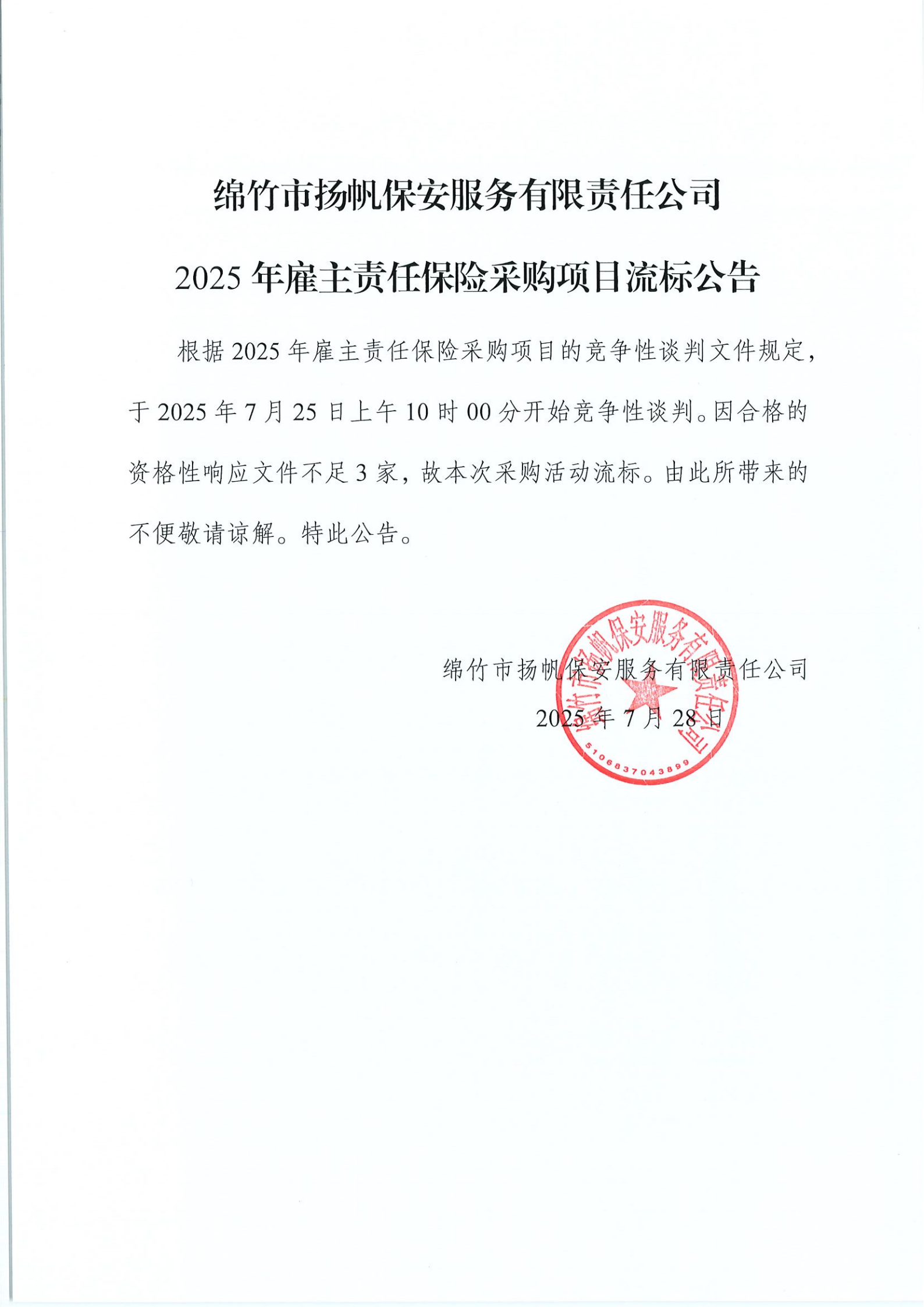 扬帆保安2025年雇主责任保险采购项目流标公告