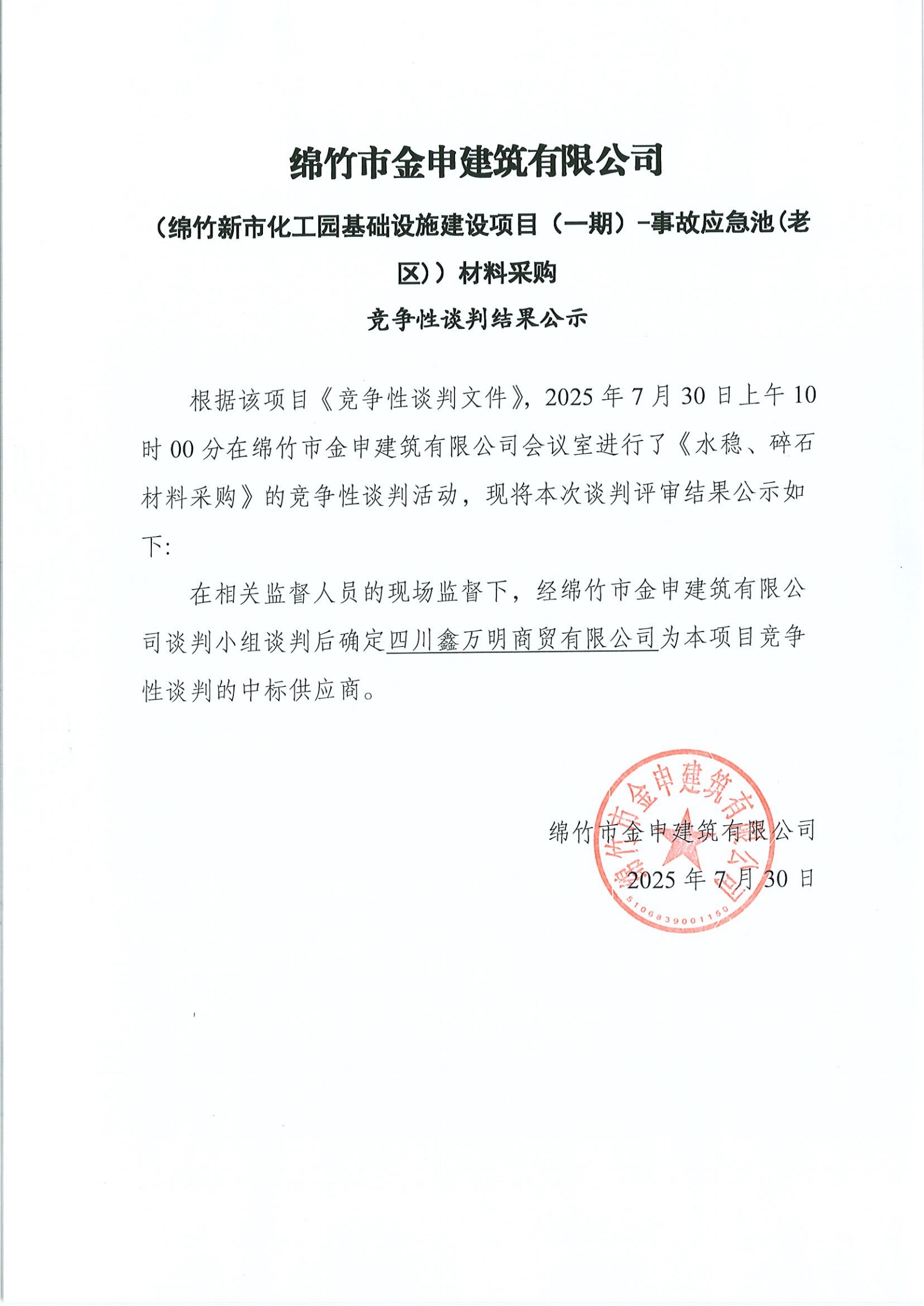 事故应急池(水稳、碎石)材料采购中标结果公示