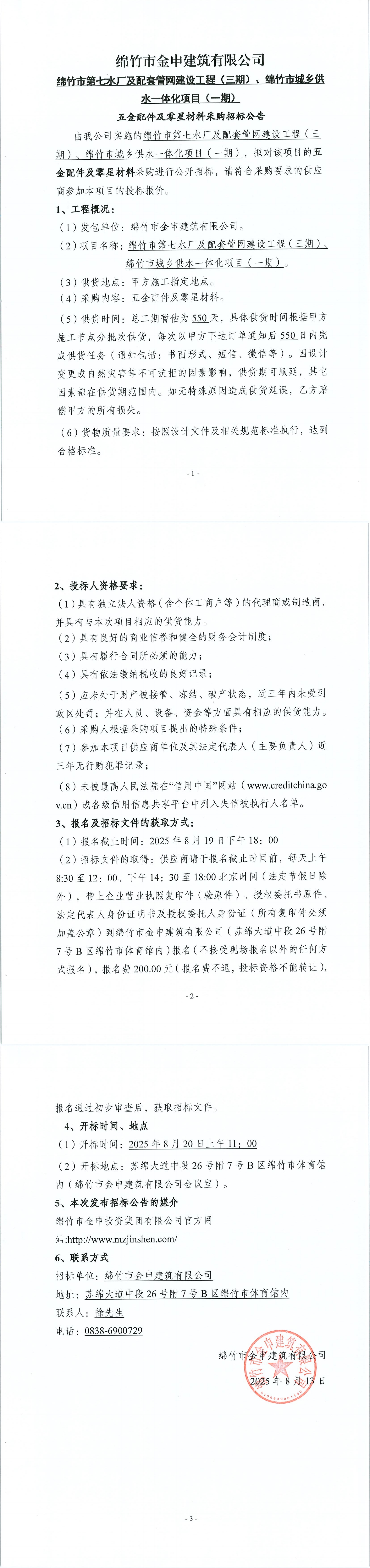 七水厂三期、城乡供水一期(五金及零星材料)竞争性谈判