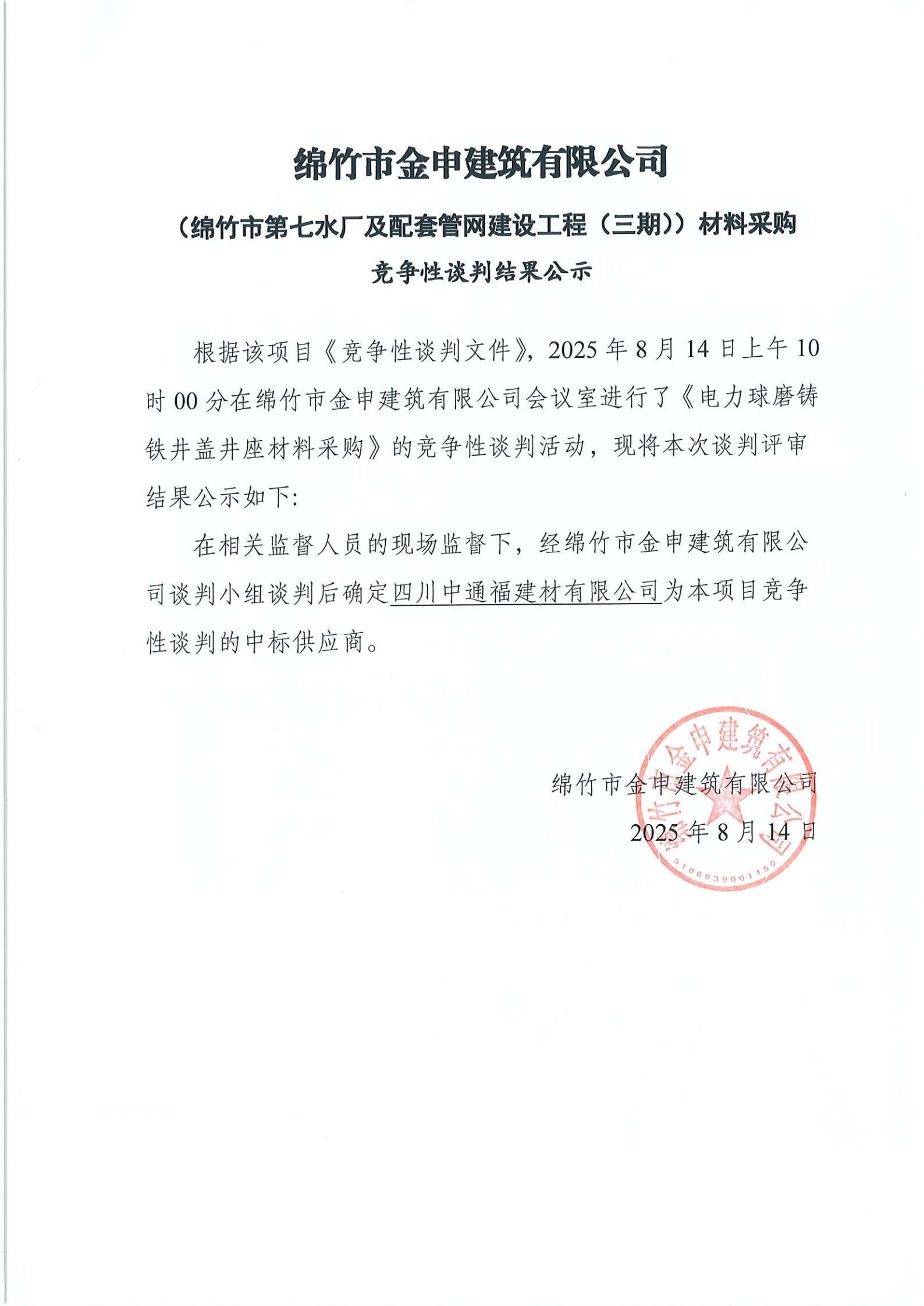 七水厂三期(球墨铸铁井盖井座)竞争性谈判结果公示