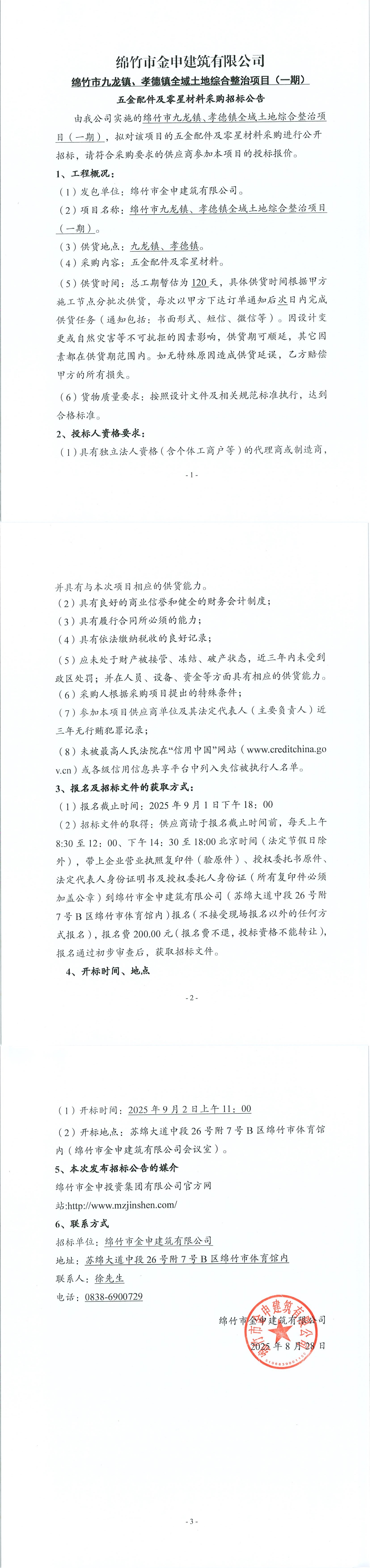 全域土地整治项目(五金配件及零星材料)招标公告