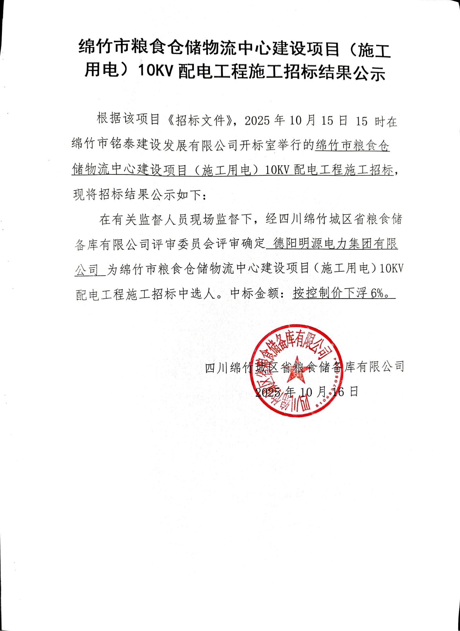 绵竹市粮食仓储物流中心建设项目(施工用电)10KV配电工程施工招标结果公示