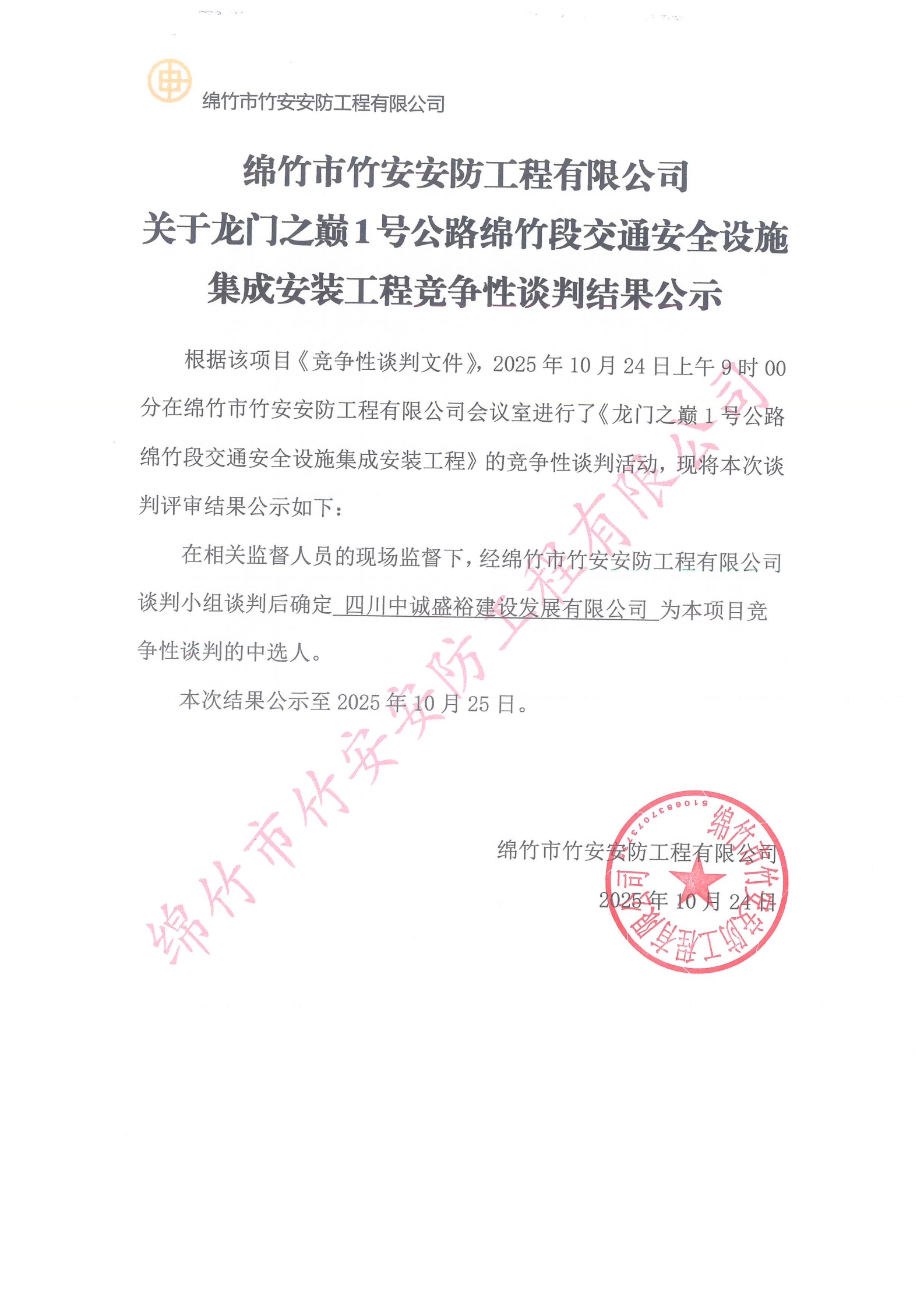 竹安安防关于龙门之巅1号公路绵竹段交通安全设施集成安装工程竞争性谈判结果公示