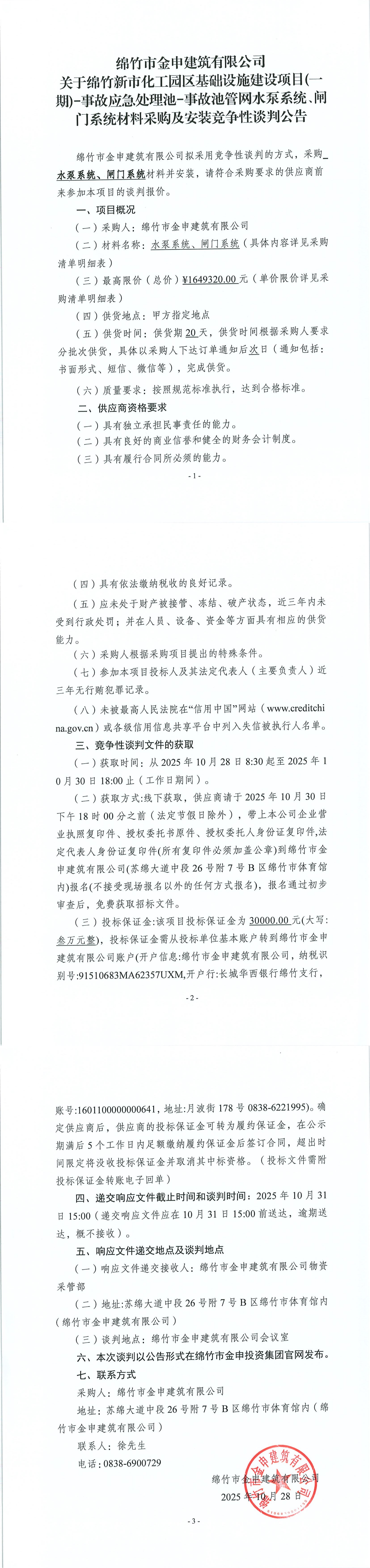 关于事故池管网(水泵系统、闸门系统)材料采购及安装竞争性谈判公告