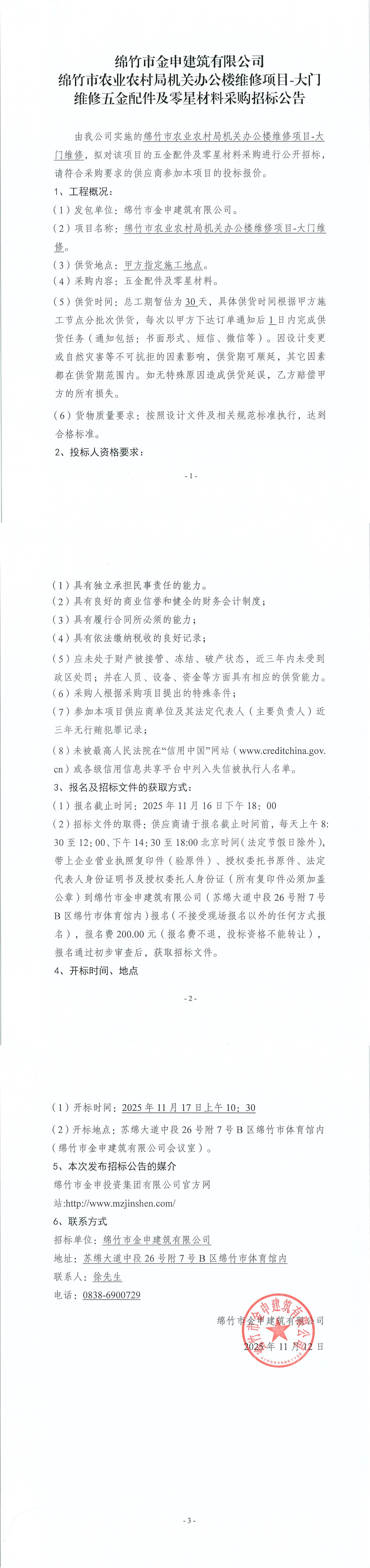 绵竹市农业农村局大门维修项目(五金材料)采购招标公告
