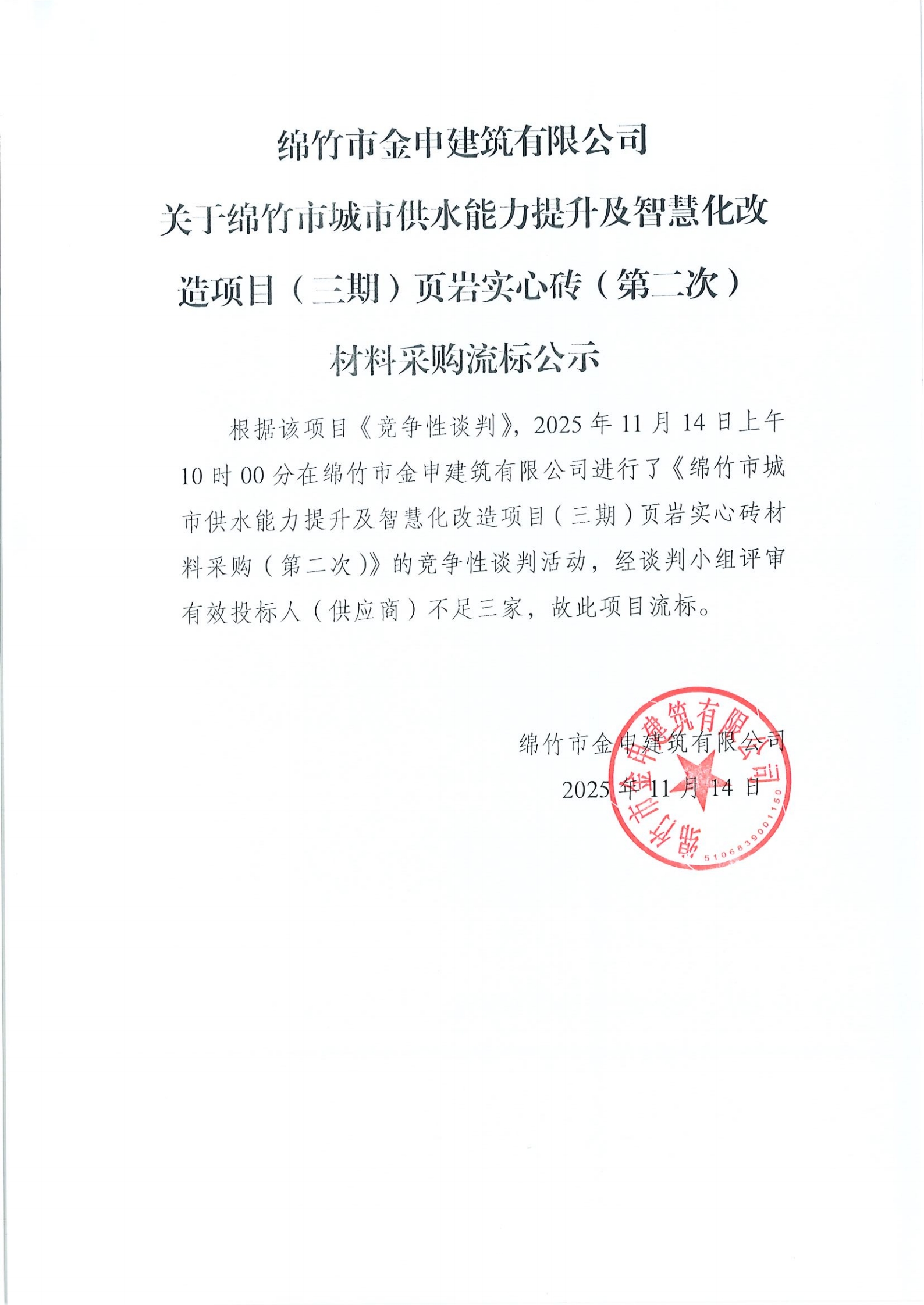 关于城市供水三期(页岩实心砖)第二次材料采购流标公示