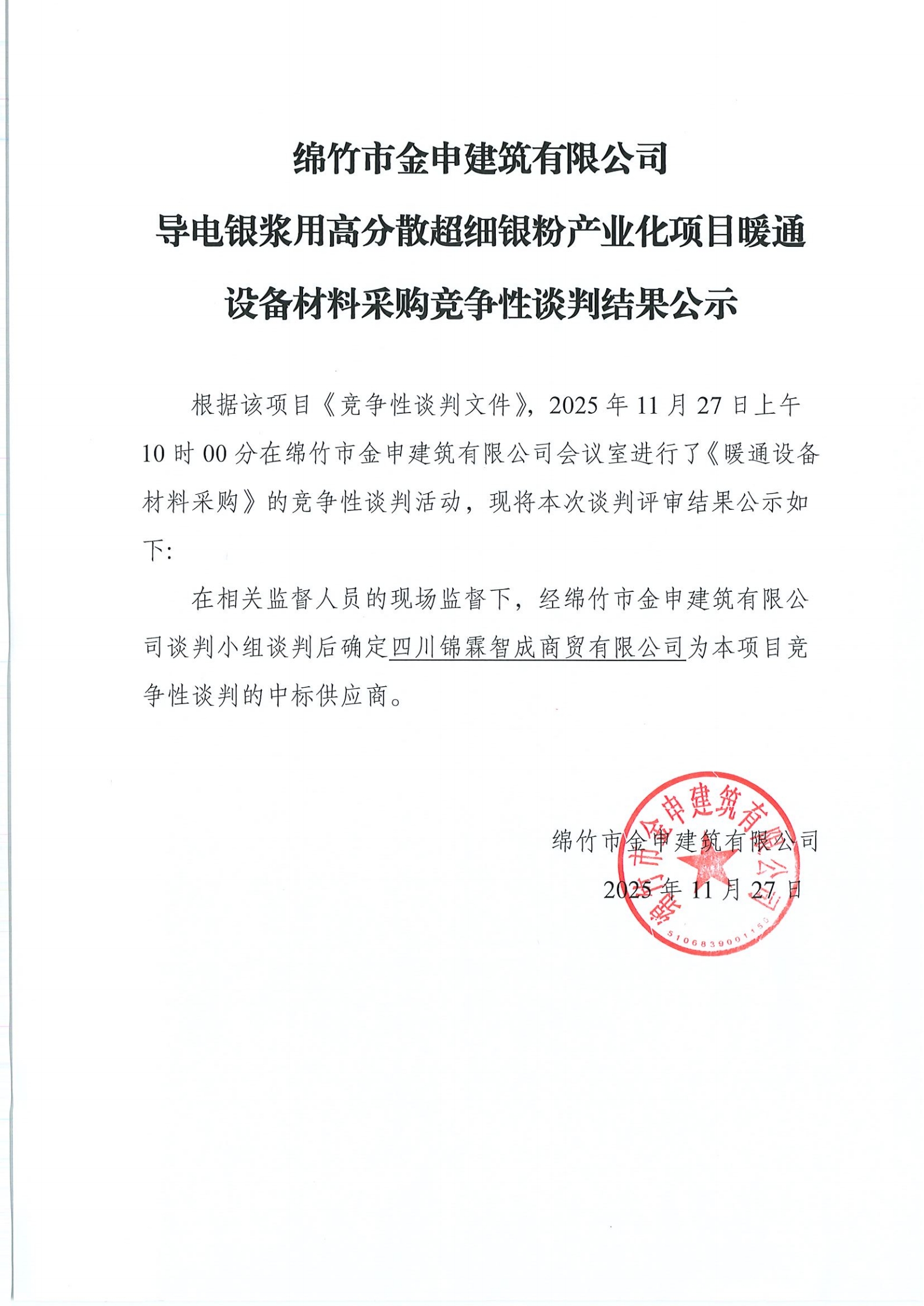 导电银浆用高分散超细银粉产业化项目暖通设备材料采购竞争性谈判结果公示