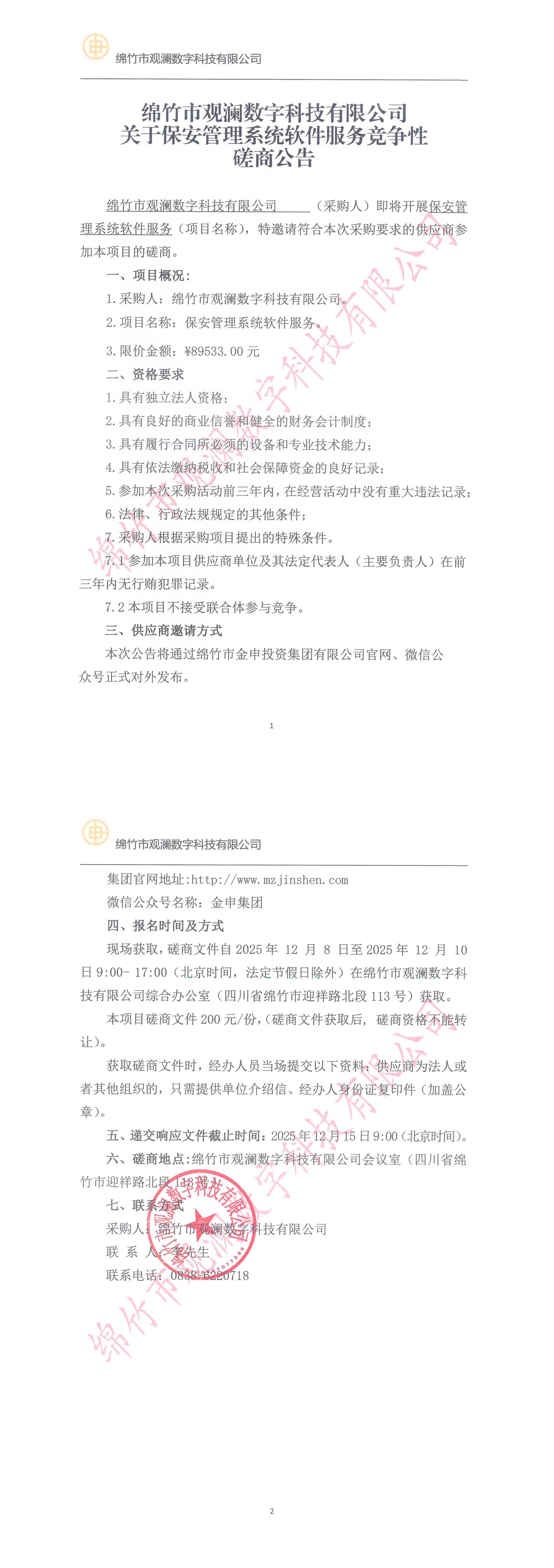 绵竹市观澜数字科技有限公司关于保安管理系统软件服务竞争性磋商公告
