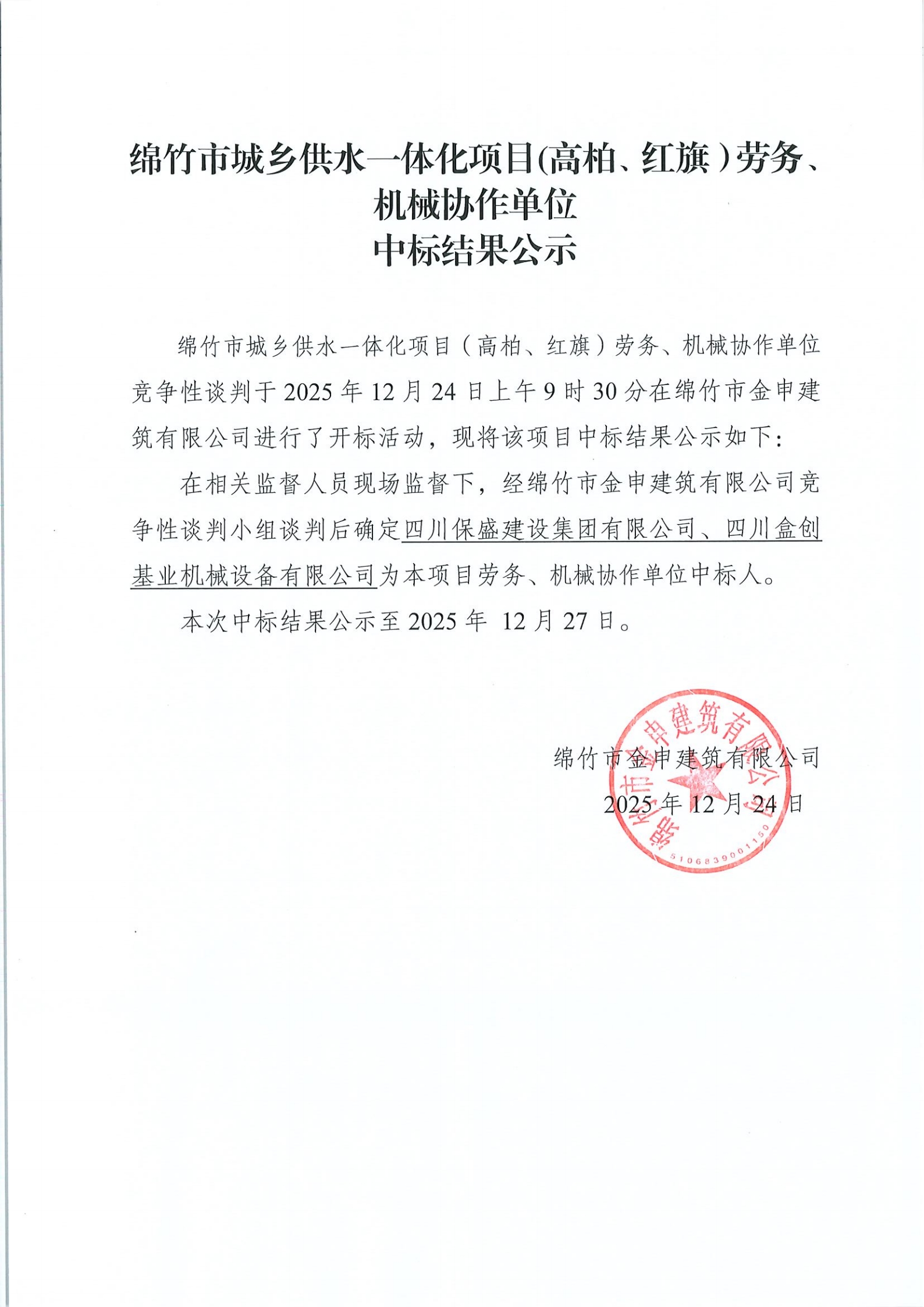 绵竹市城乡供水一体化项目(高柏、红旗)劳务、机械协作单位中标结果公示