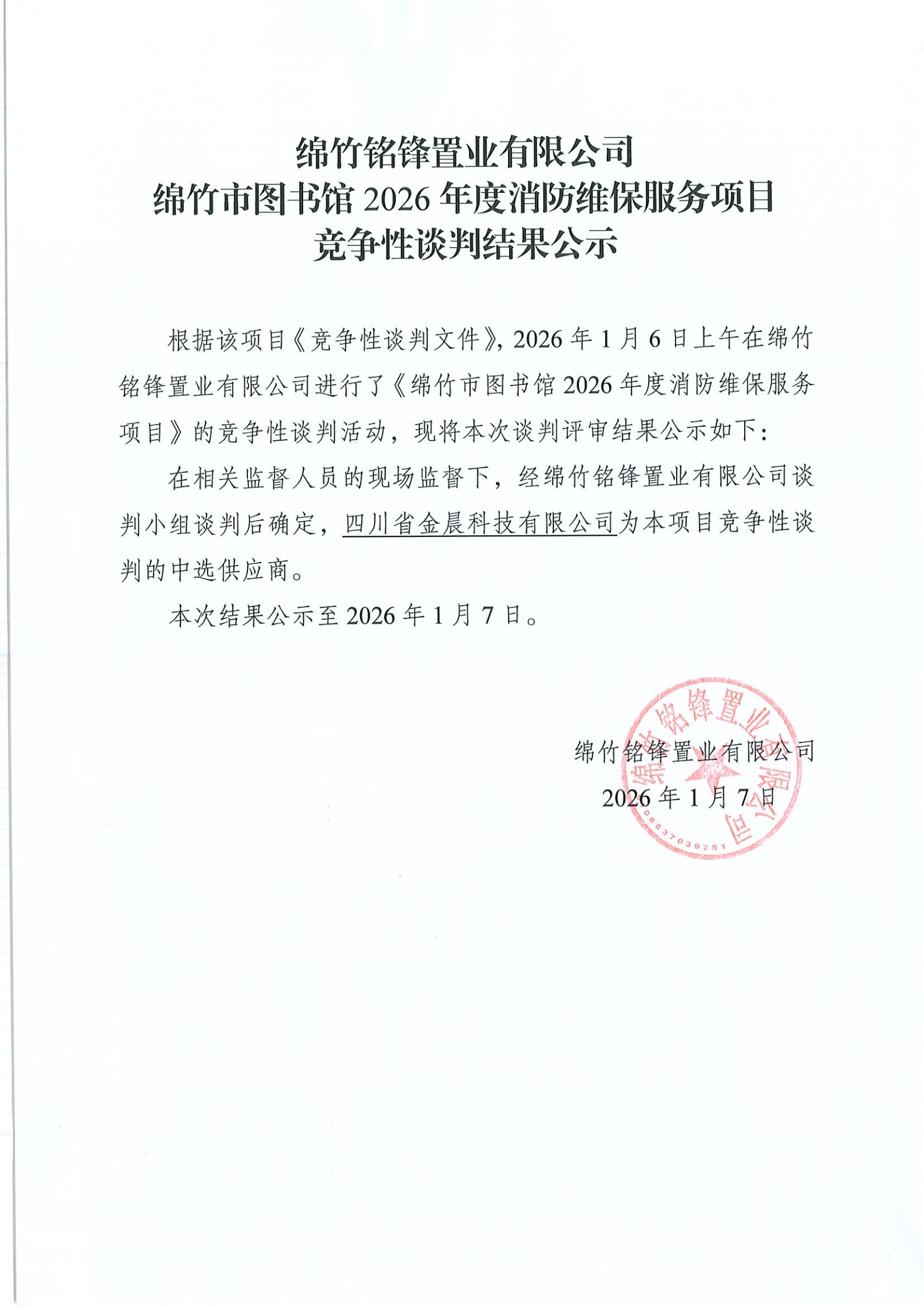 绵竹市图书馆2026年度消防维保服务项目竞争性谈判结果公示