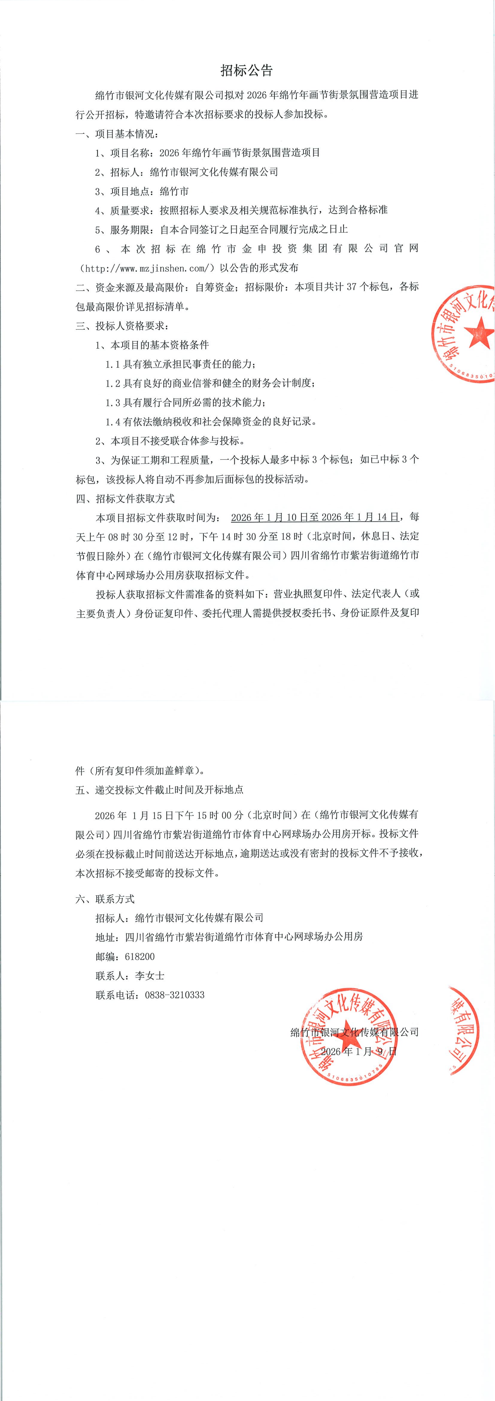 银河传媒2026年绵竹年画节街景氛围营造项目招标公告