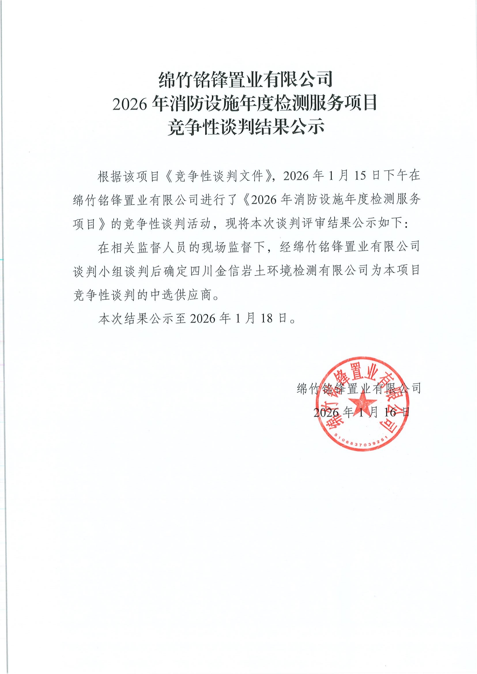 2026年消防设施年度检测服务项目竞争性谈判结果公示