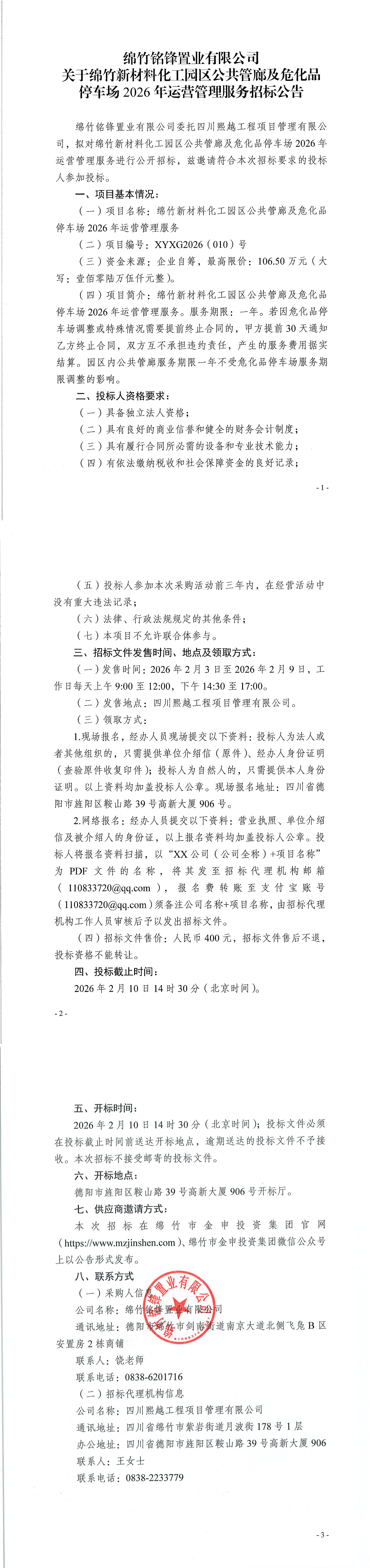 绵竹新材料化工园区公共管廊及危化品停车场2026年运营管理服务招标公告