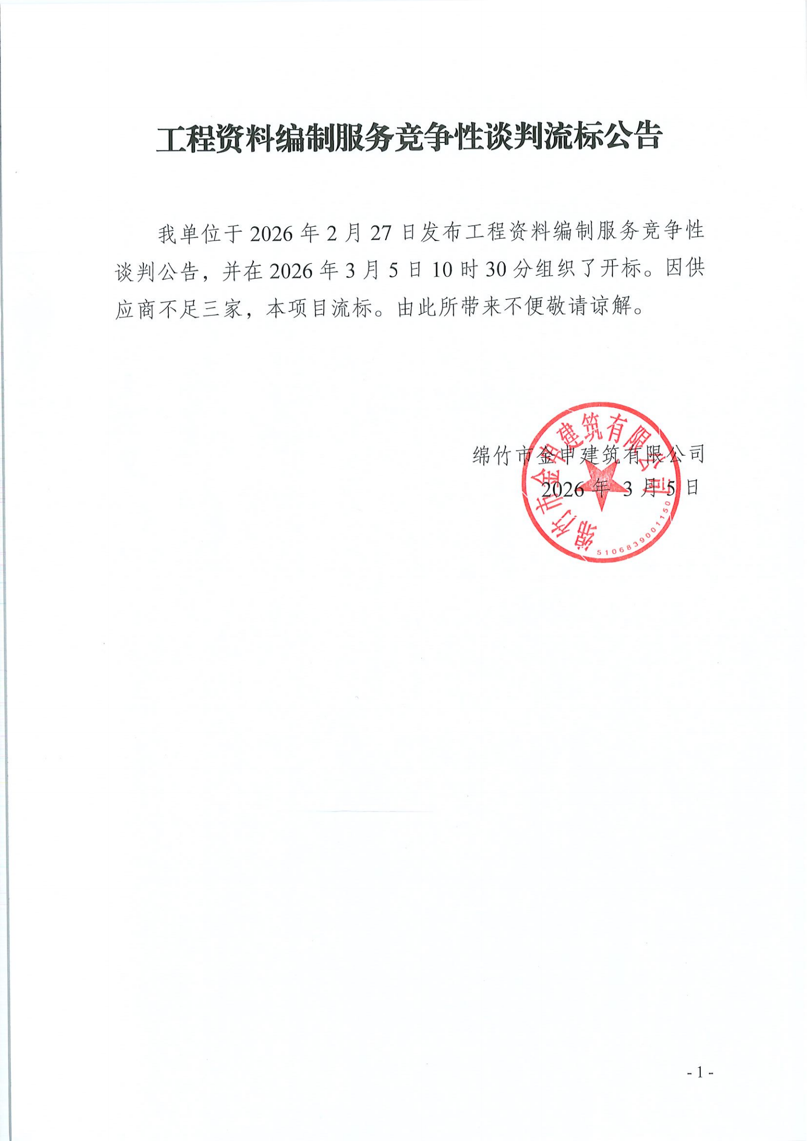 金申建筑关于工程资料编制服务竞争性谈判流标公告