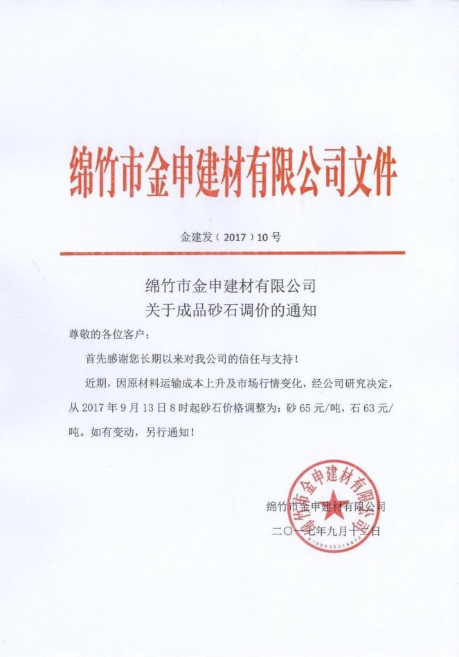 金申建材公司关于成品砂石调价的通知