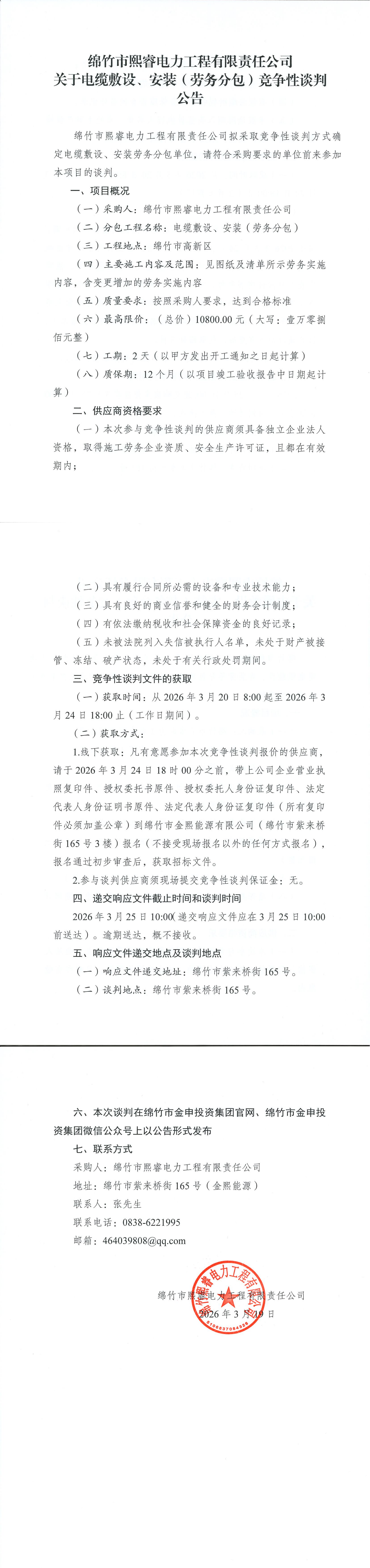 熙睿电力关于电缆敷设、安装(劳务分包)竞争性谈判公告