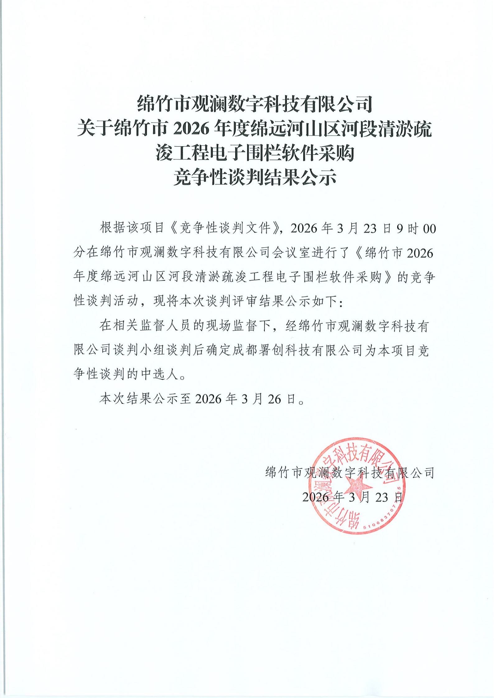 观澜数科关于2026年度绵远河山区河段清淤疏浚工程电子围栏软件采购竞争性谈判结果公示