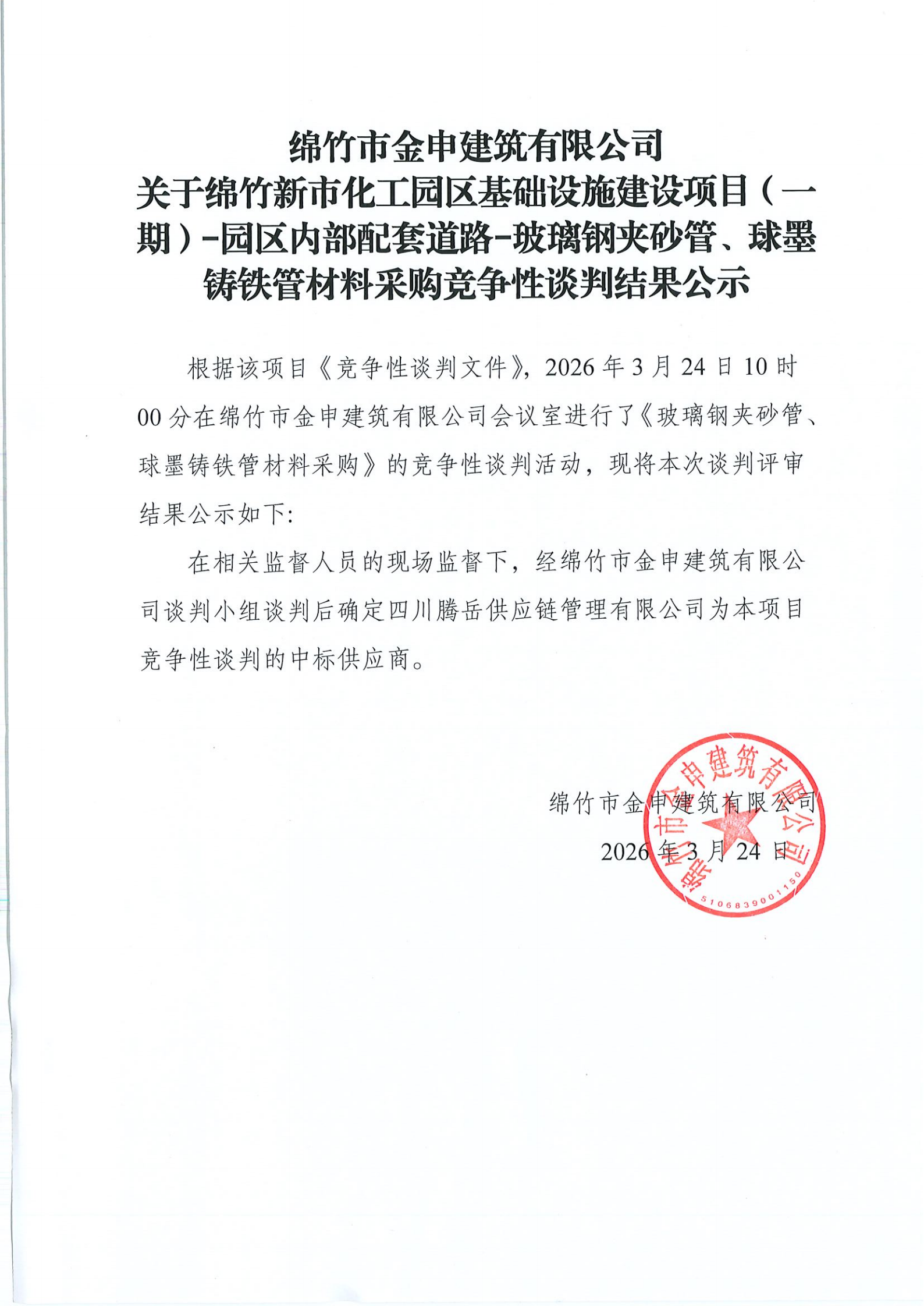金申建筑关于绵竹新市化工园区道路玻璃钢夹砂管、球墨铸铁管材料采购竞争性谈判结果公示