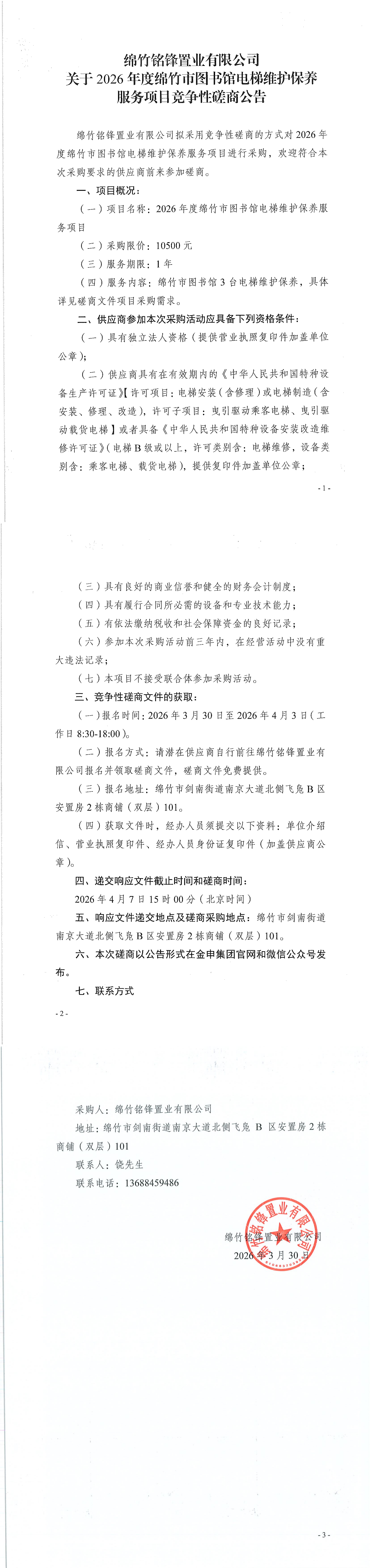 2026年度绵竹市图书馆电梯维护保养服务项目竞争性磋商公告