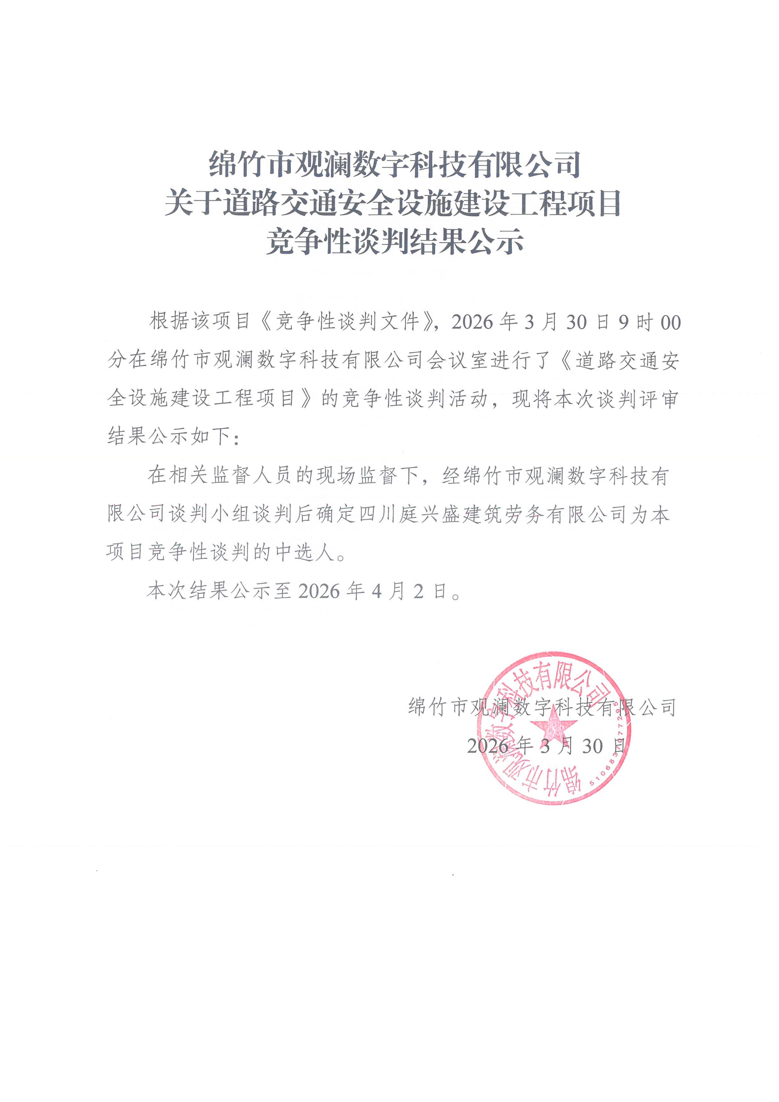 观澜数科关于道路交通安全设施建设工程项目竞争性谈判结果公示