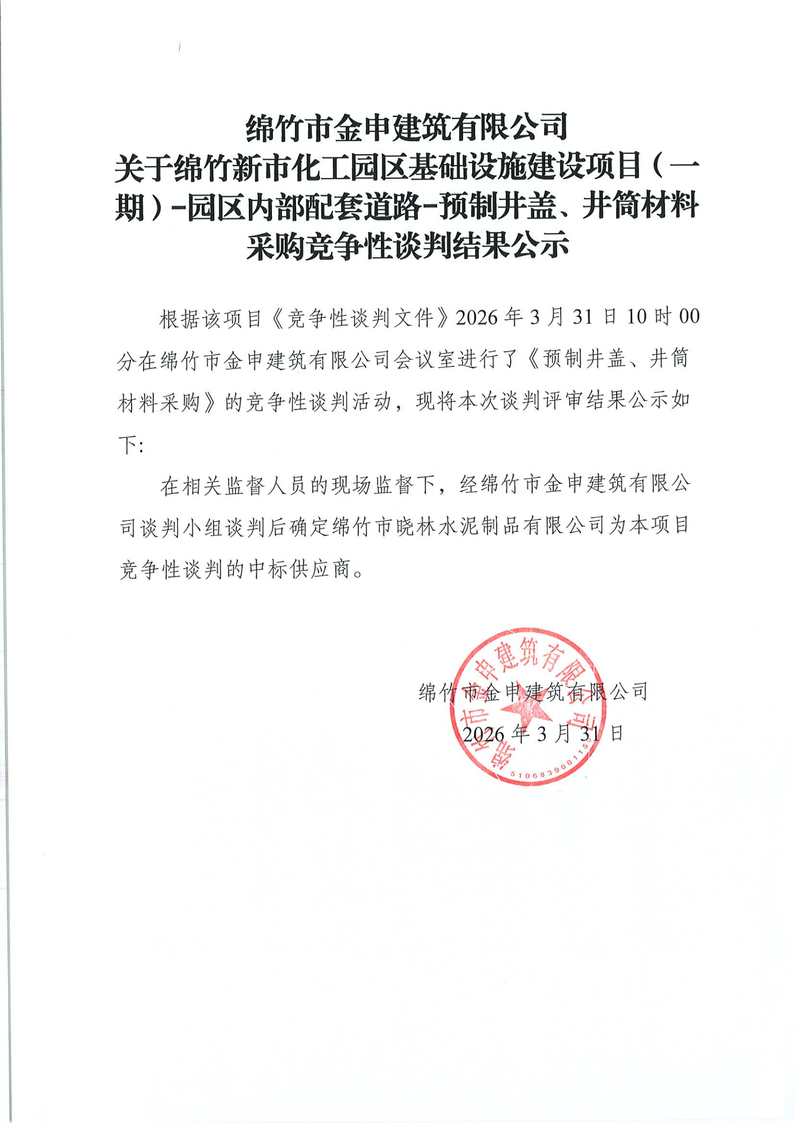 金申建筑关于新市化工园区内部道路预制井盖、井筒材料采购竞争性谈判结果公示