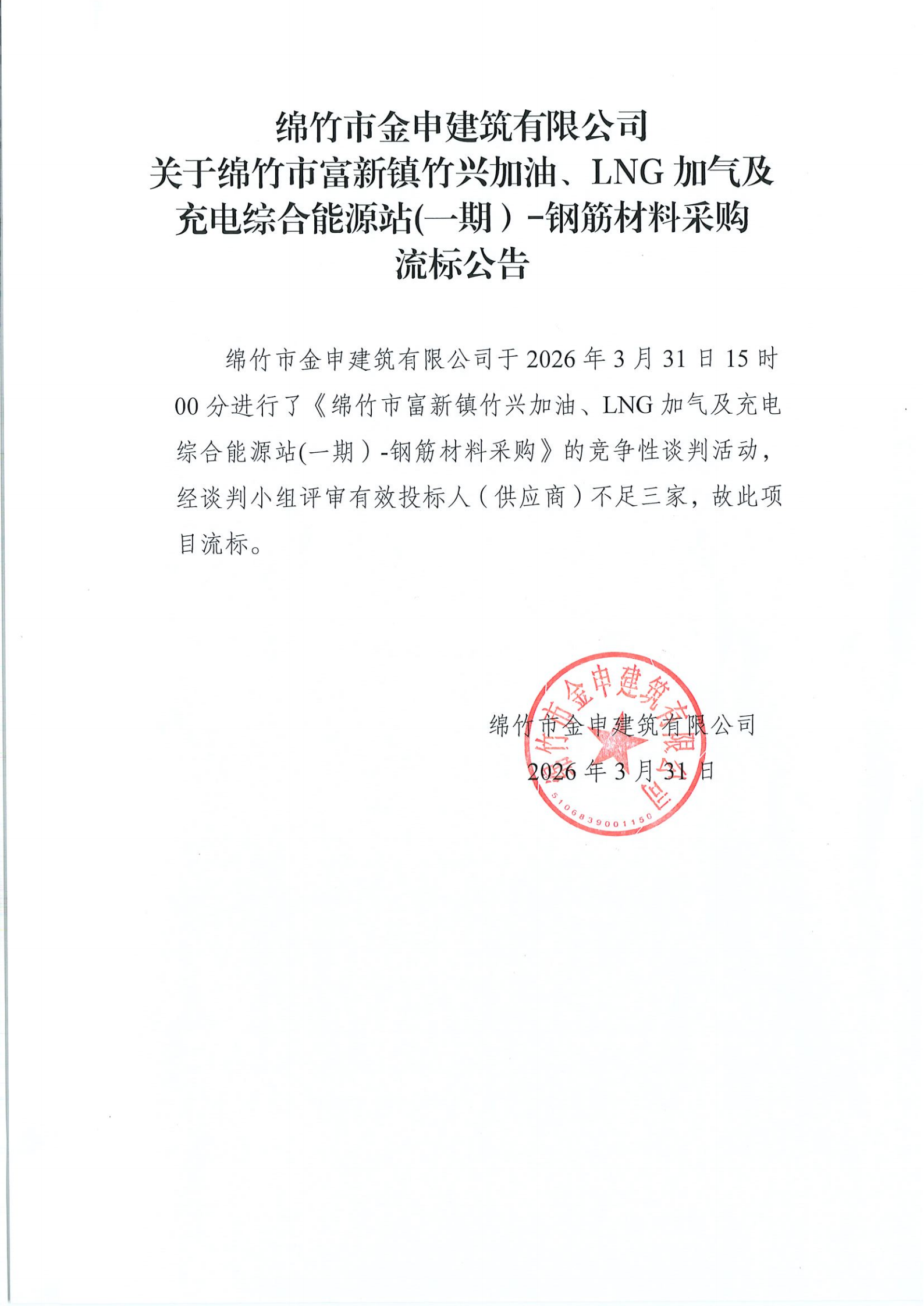 金申建筑关于能源站钢筋材料采购竞争性谈判流标公告