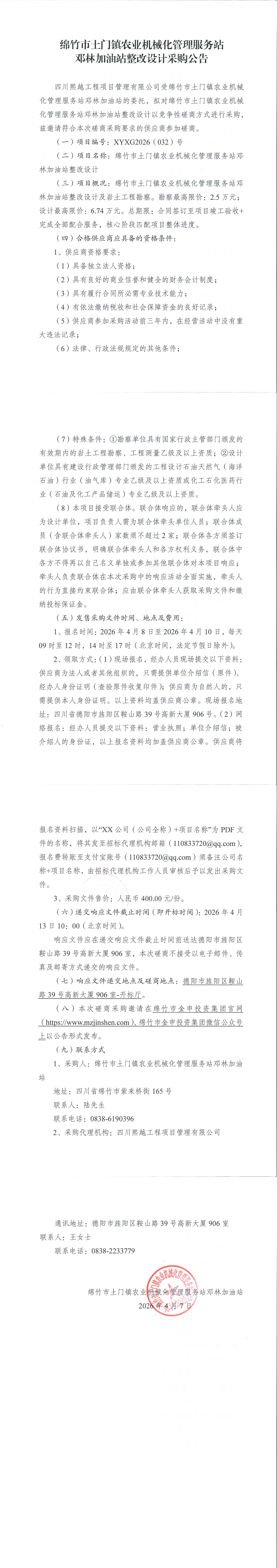 绵竹市士门镇农业机械化管理服务站邓林加油站整改设计采购公告