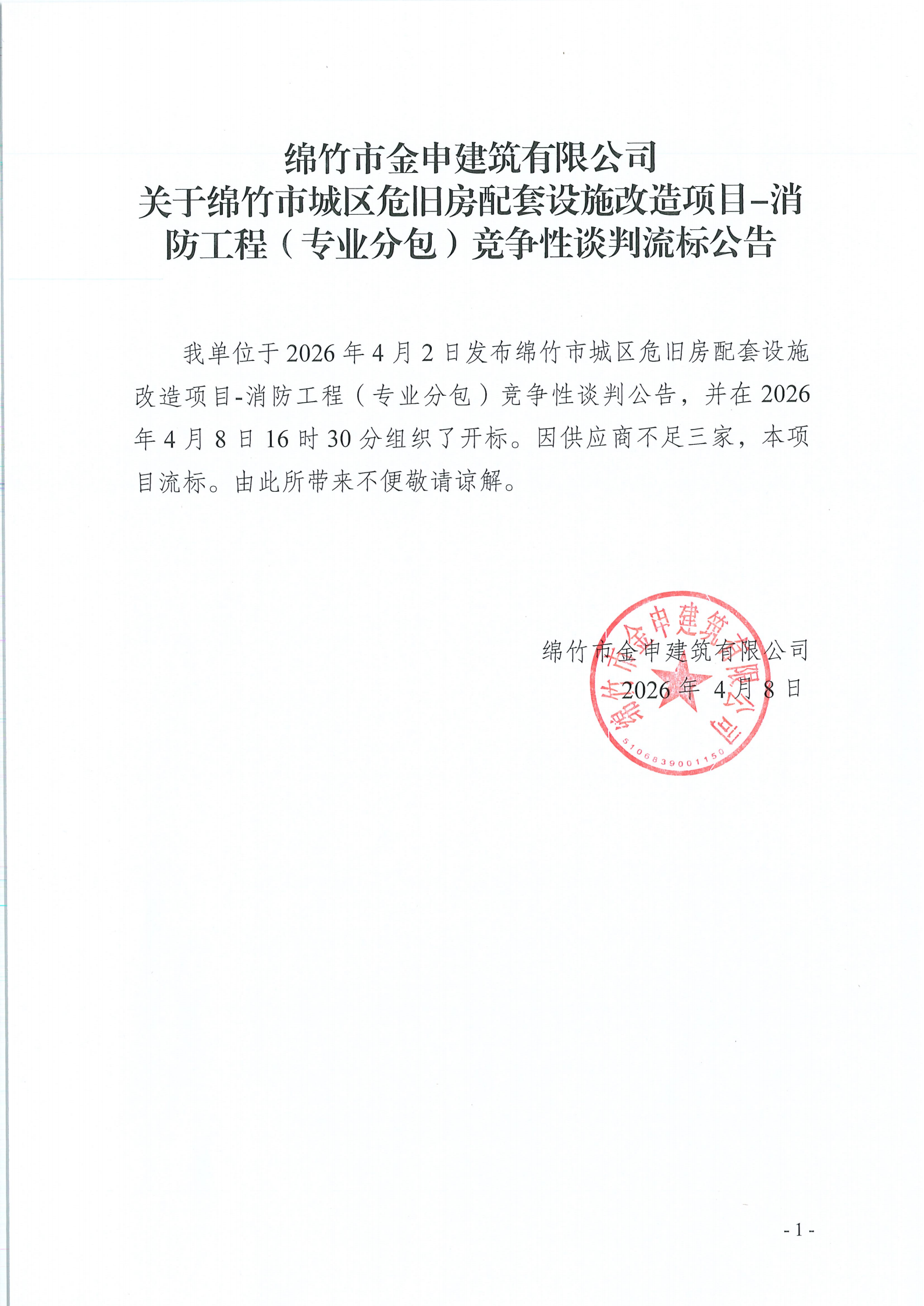 金申建筑关于绵竹市城区危旧房配套设施改造项目-消防工程(专业分包)竞争性谈判流标公告