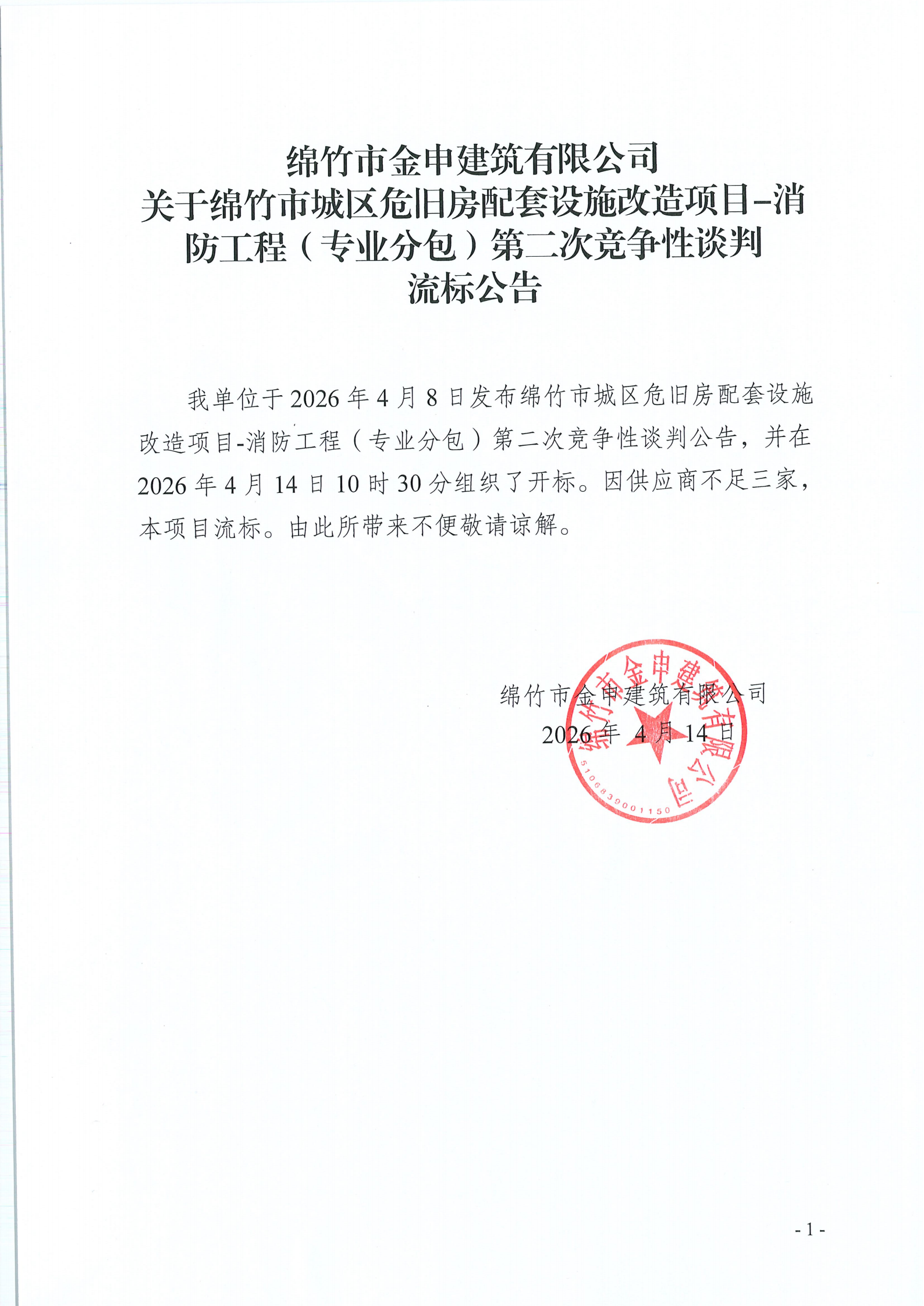 金申建筑关于绵竹市城区危旧房配套设施改造项目-消防工程(专业分包)第二次竞争性谈判流标公告
