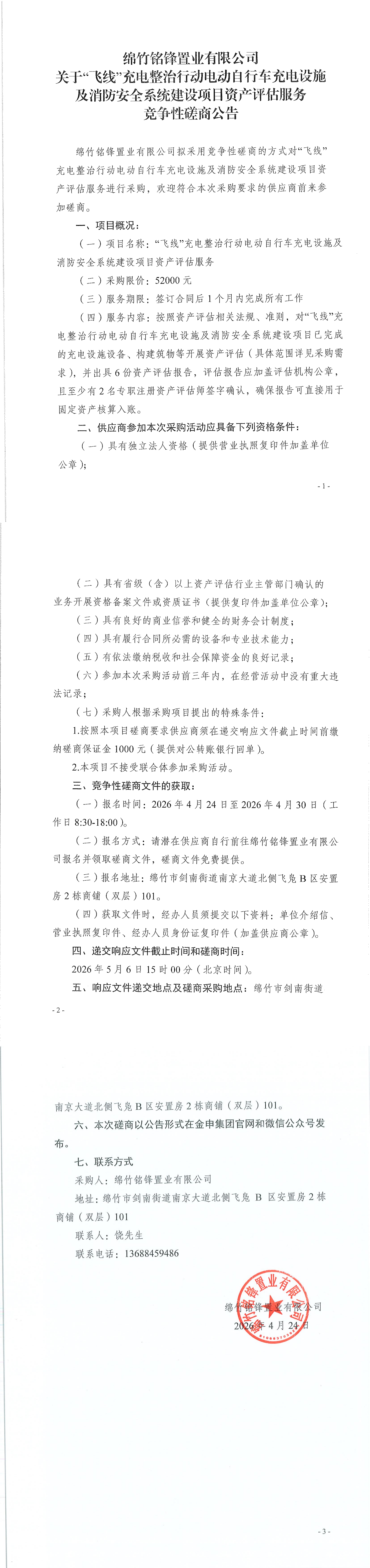 铭锋置业关于“飞线”充电整治行动电动自行车充电设施及消防安全系统建设项目资产评估服务竞争性磋商公告