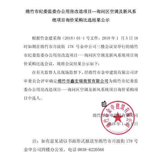 市纪委监委办公用房询问区空调及新风系统采购比选结果