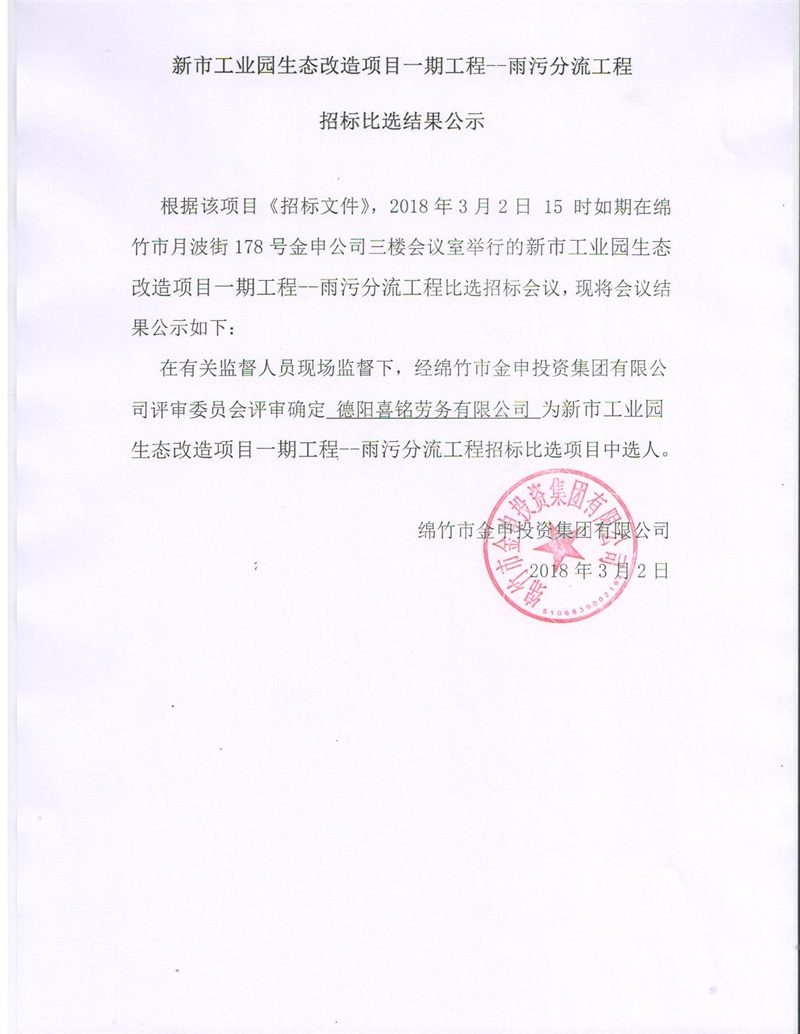 新市工业园生态改造项目一期雨污分流工程招标结果公示
