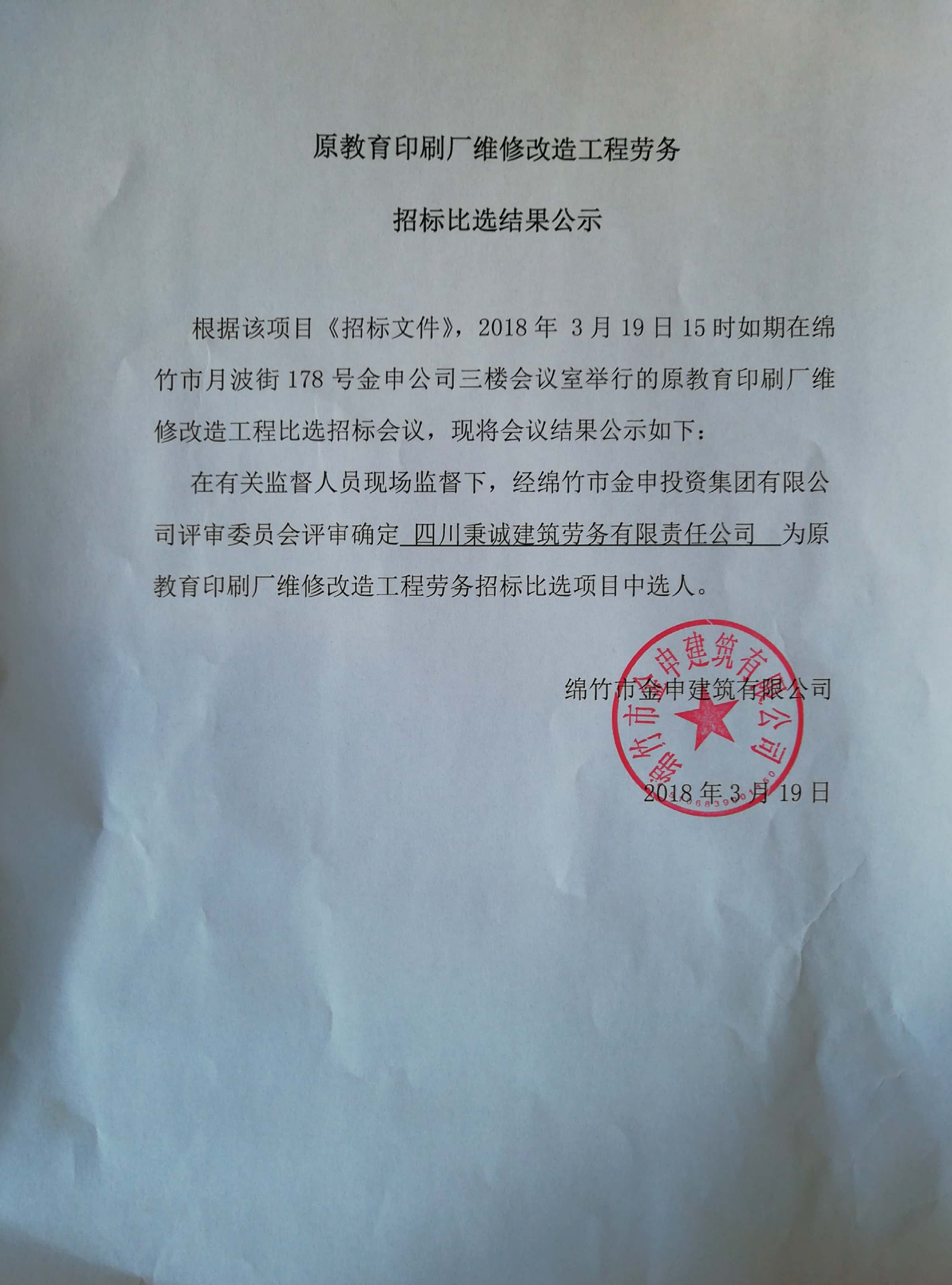 原教印厂维修改造劳务招标比选结果公示