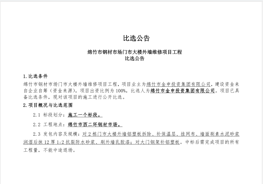 钢材市场门市大楼外墙维修项目比选公告