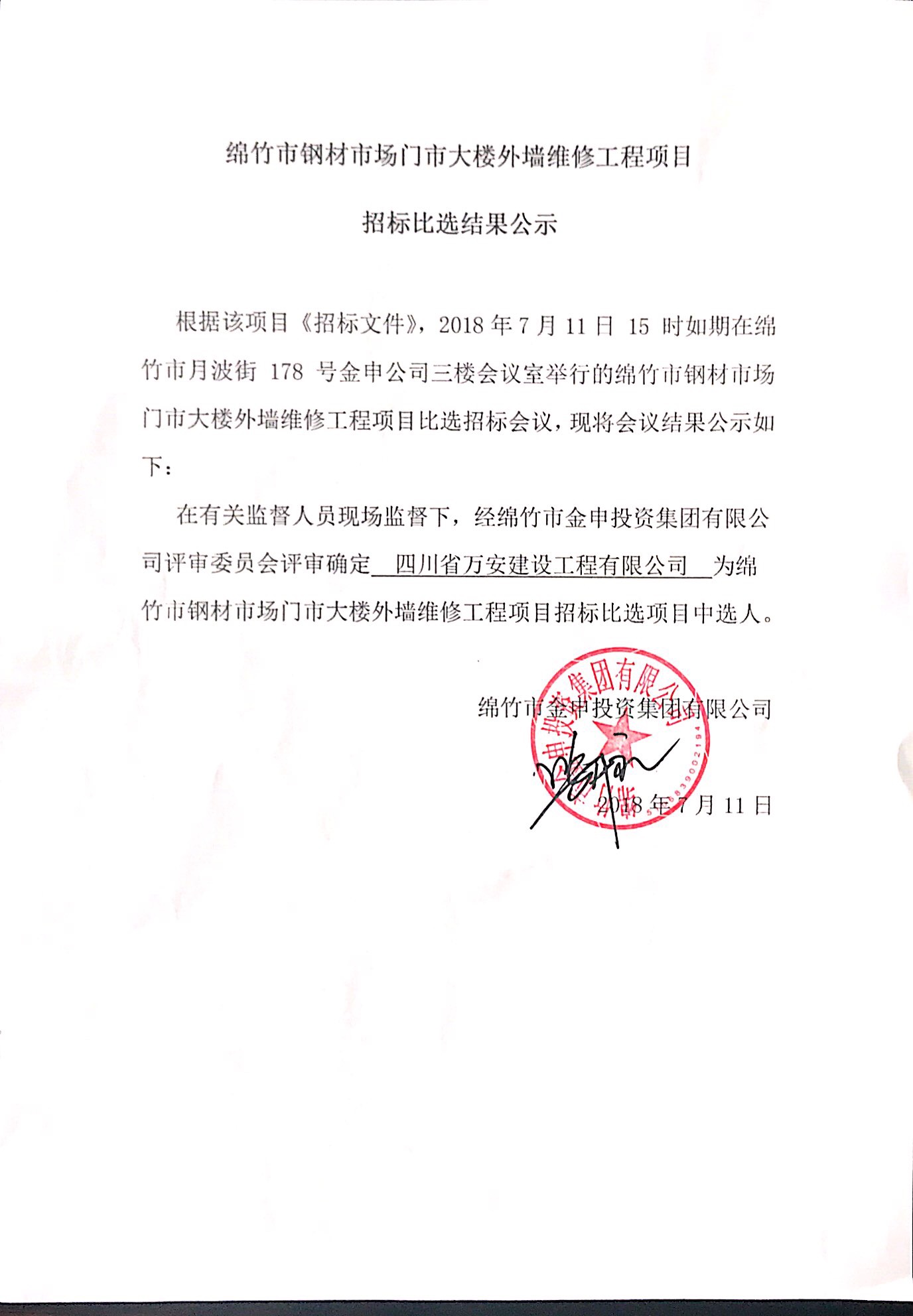 钢材市场门市外墙维修招标比选结果公示