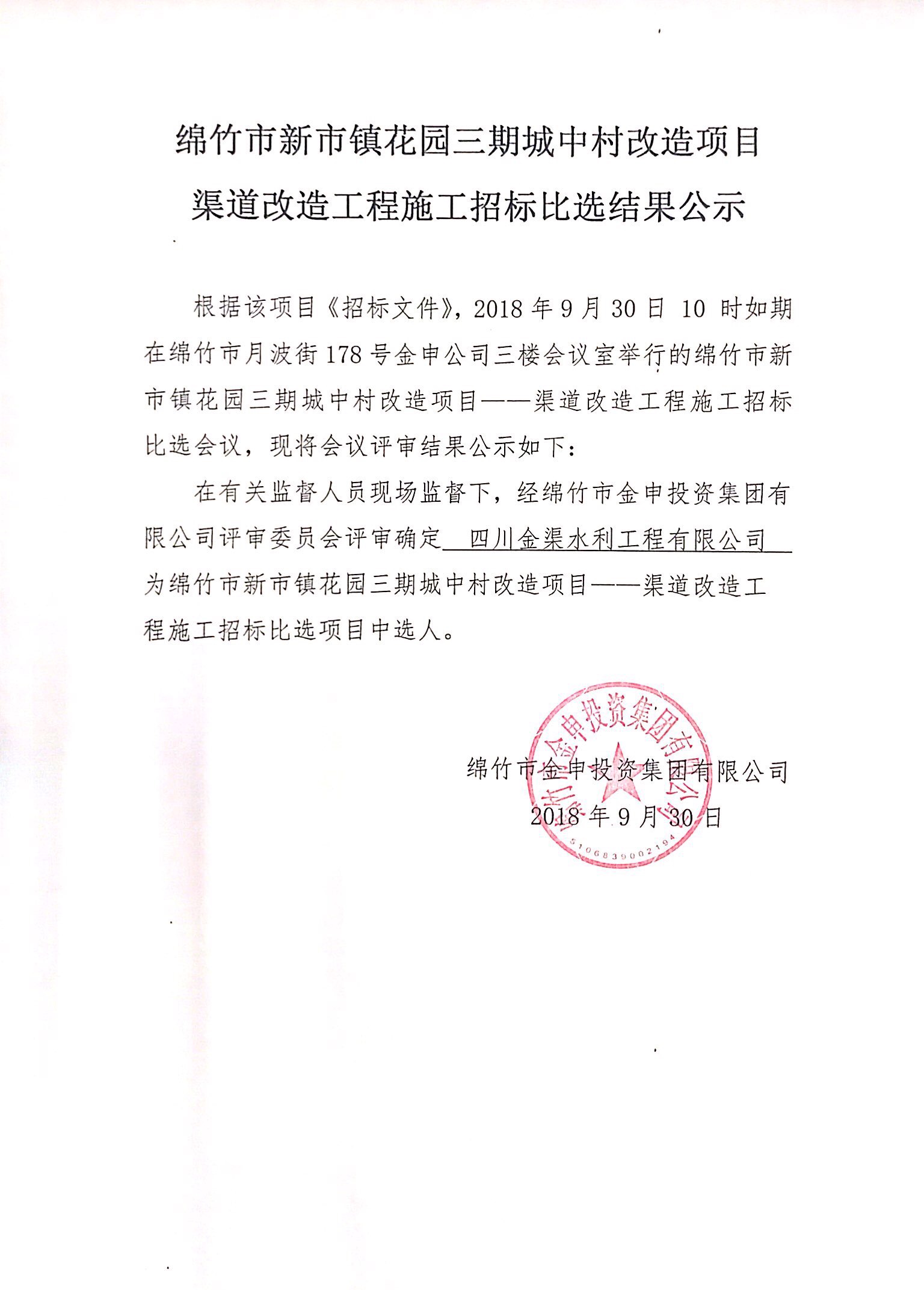 新市花园三期渠道改造项目施工比选结果公示