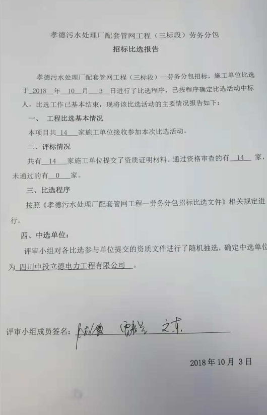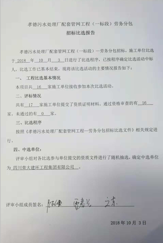 孝德污水处理厂配套管网工程劳务分包招标比选报告