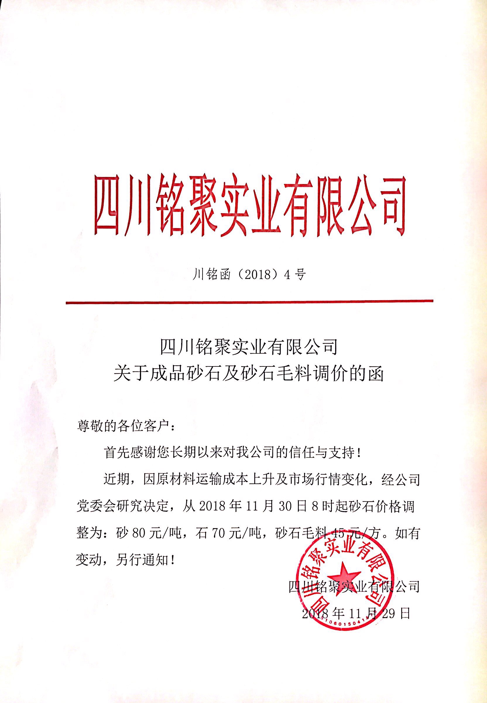 铭聚公司关于成品砂石及砂石毛料调价的函