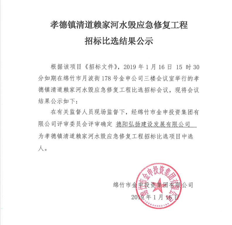 孝德镇清道赖家河水毁应急修复工程比选结果公示