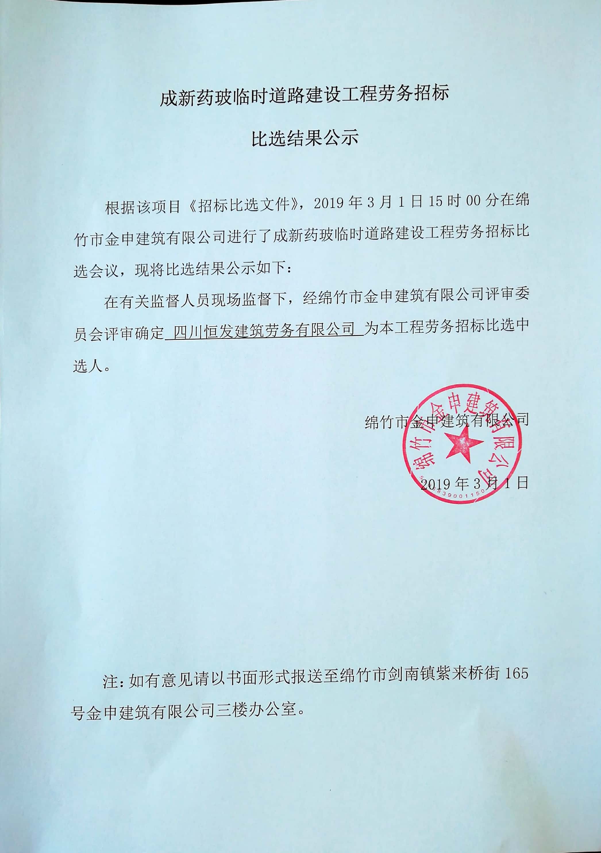 成新药波临时道路建设工程劳务招标比选结果公示
