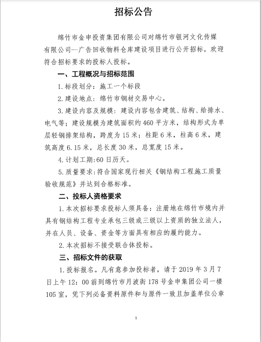 金申集团对银河传媒广告回收物料仓库建设项目招标公告