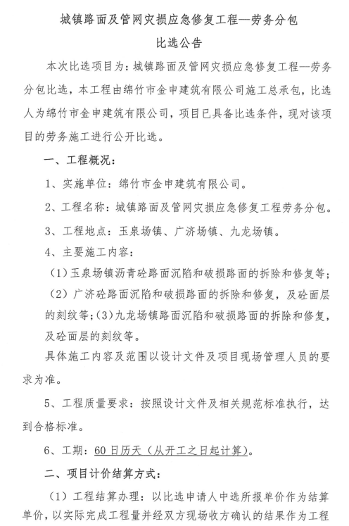 关于城镇路面及管网灾损应急修复工程劳务分包比选公告