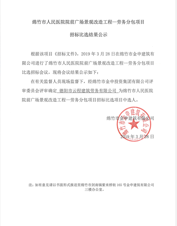 市人民医院前广场景观改造工程劳务分包比选结果公示