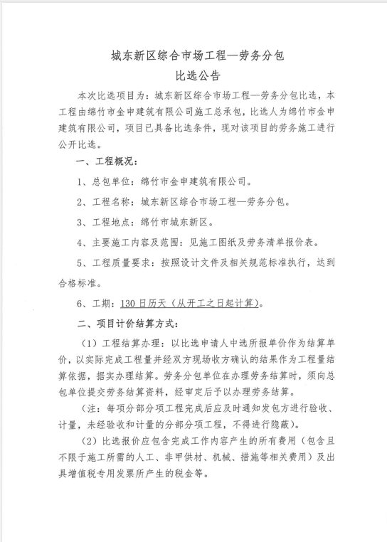 城东新区综合市场工程——劳务分包比选公告