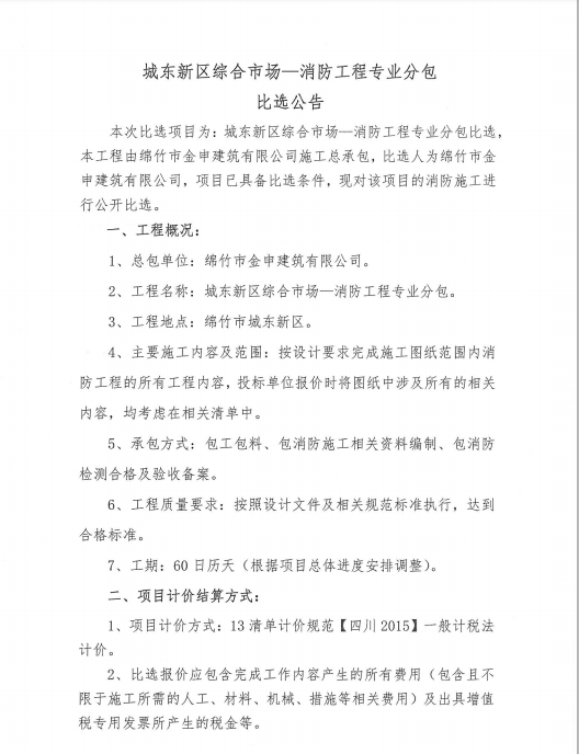 城东市场—消防工程专业分包比选公告
