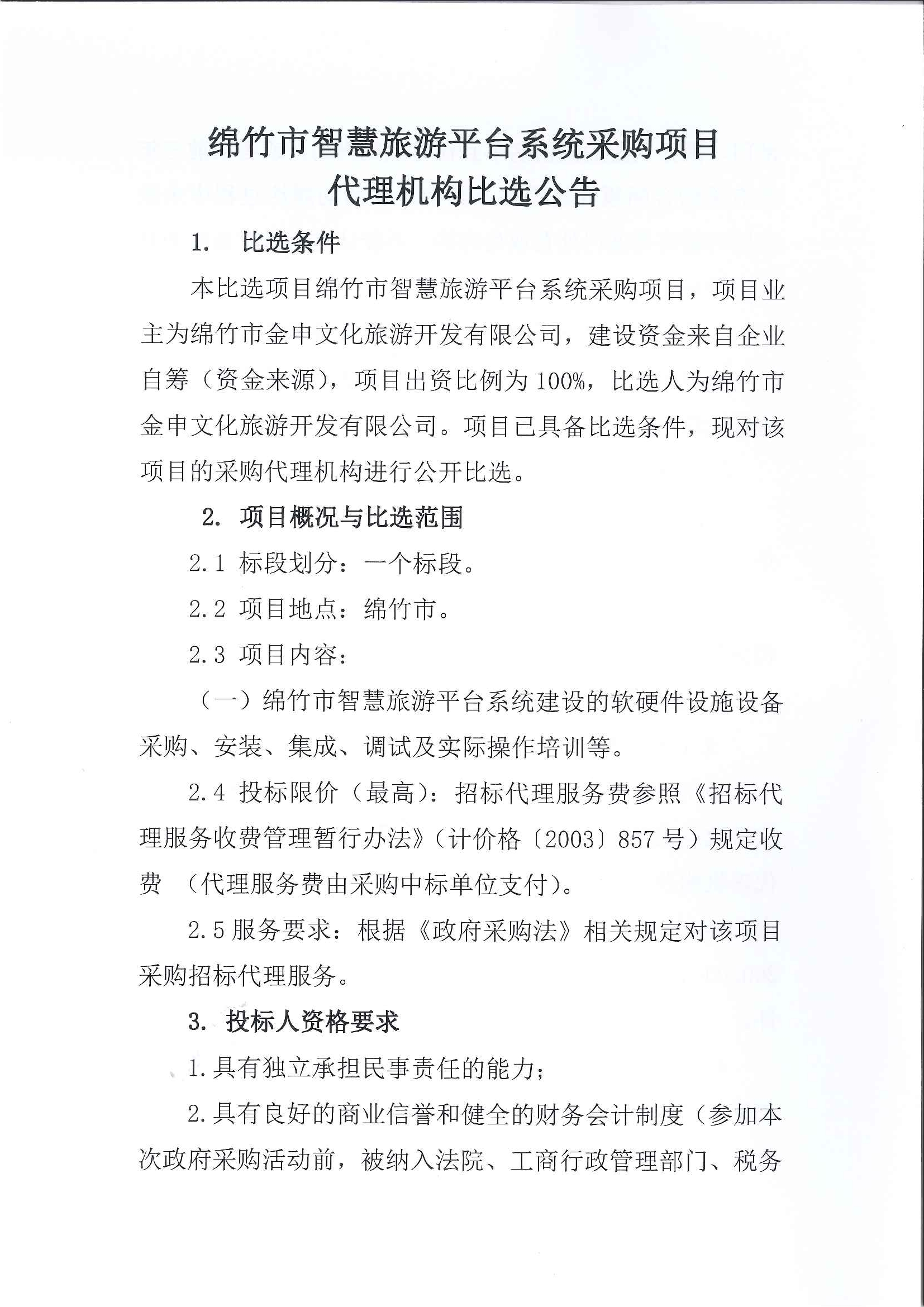 绵竹市智慧旅游平台系统采购项目代理机构比选公告