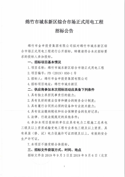 绵竹市城东新区综合市场正式用电工程招标公告